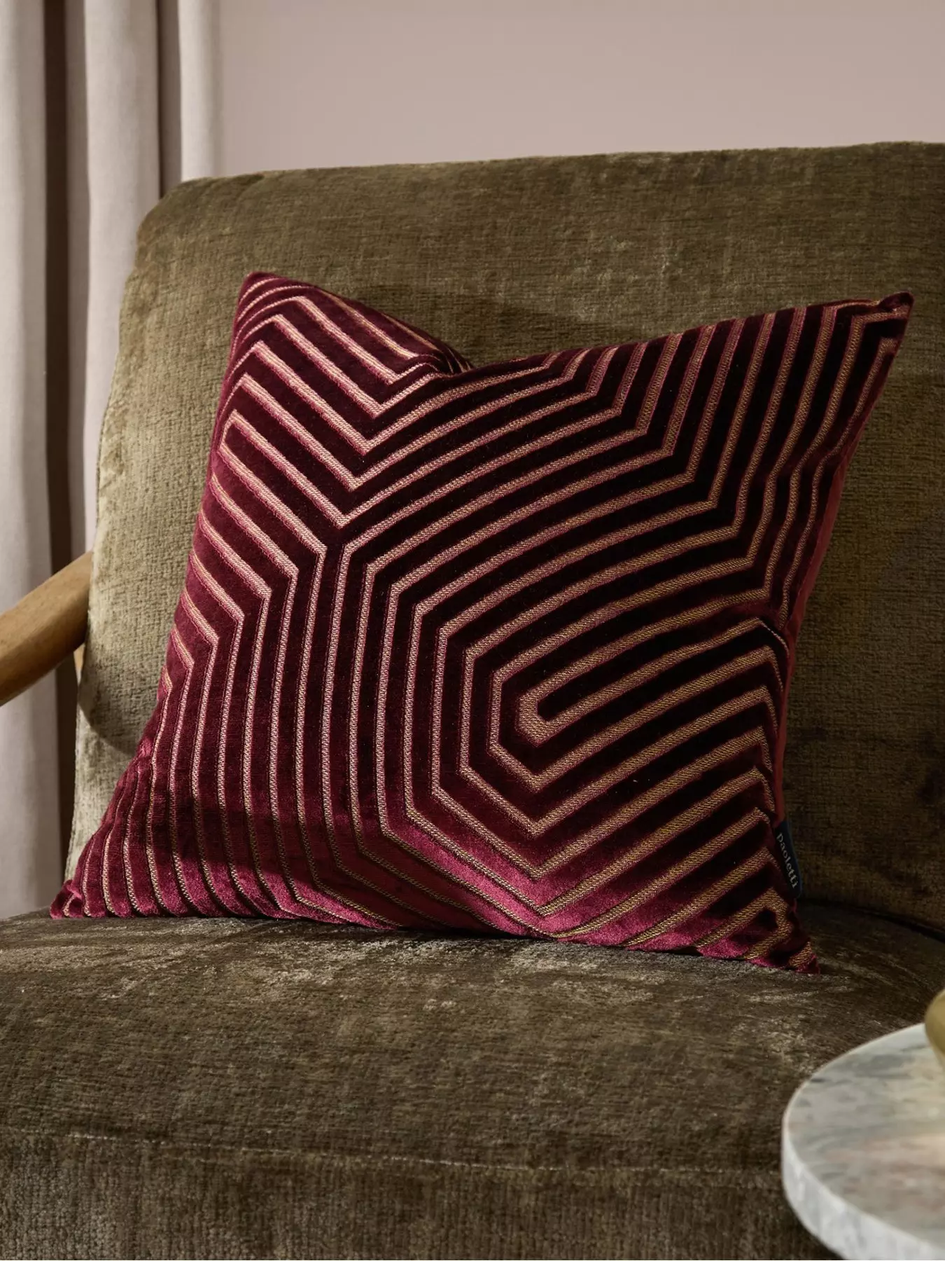 - Add a touch of opulence with this velvet cushion featuring an elegant geometric chevron pattern.