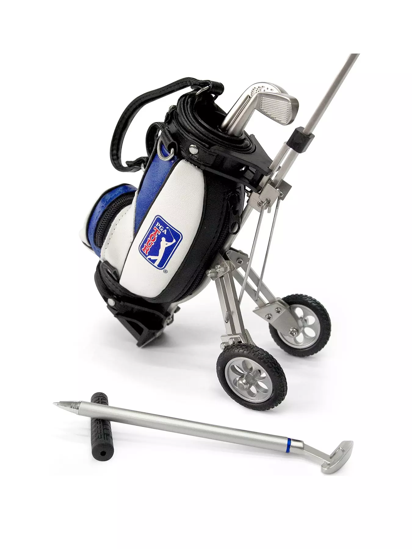 Ideal for the office secret Santa or even as a little birthday gift, this PGA Tour branded model golf bag and cart doubles as a handy pen holder. It includes a set of 3 'golf club' style ballpoint pens, too!The Driver features red ink, the Iron has black ink, and the Putter had blue ink. It's the perfect stationary set for any golfer, and also comes with a luxury removable golf bag and mini folding steel golf trolley.