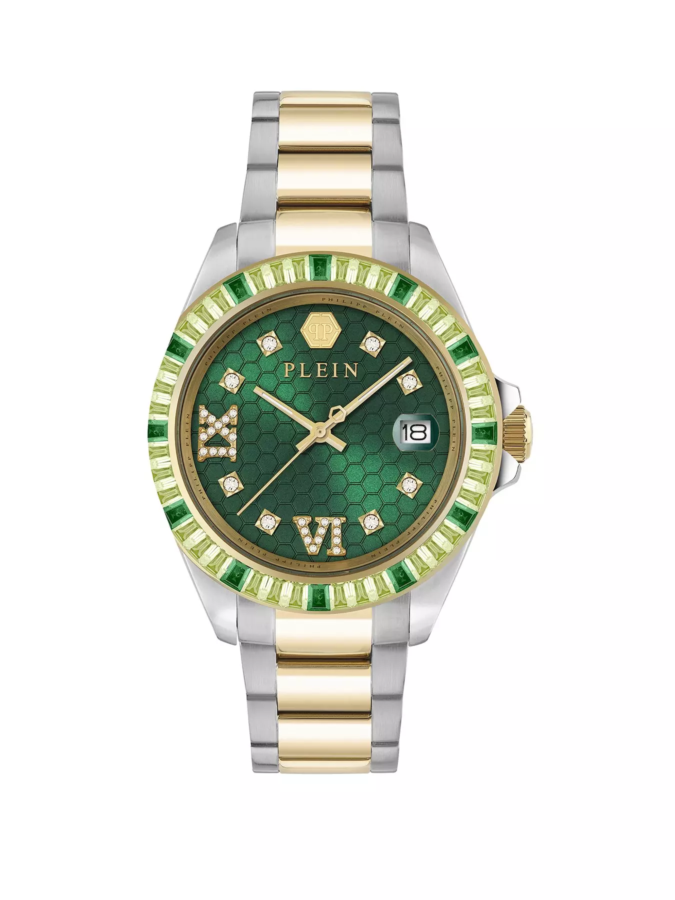 PHILIPP PLEIN LADY EMPIRE 39MM TWO TONE IPYG CRYSTAL, GREEN DIAL CRYSTAL WATCH- 24Hr Display: N