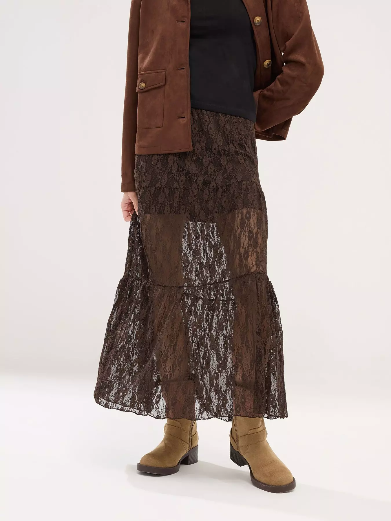 PixieGirlPetite Lined Lace Maxi Skirt - Brown