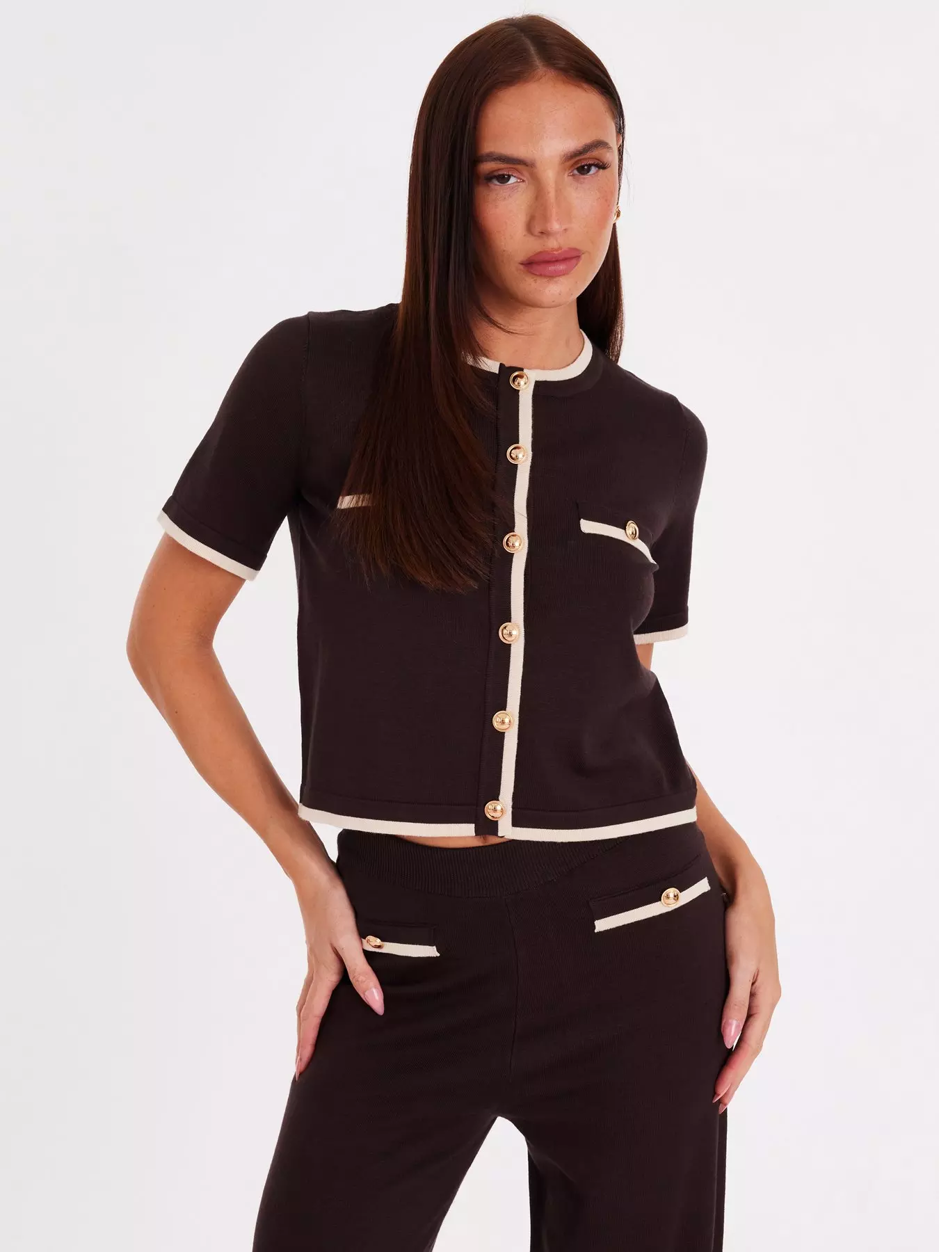- Light knit finish - Contrast trim - Button front details - Short sleeves - Cropped fit - Model height: 5'9" - Model wears uk 8 / us 4 / eur 36 - Always check the wash care label - Cool hand wash with mild detergent- Material Content: Viscose 69 %, Polyester 31 %