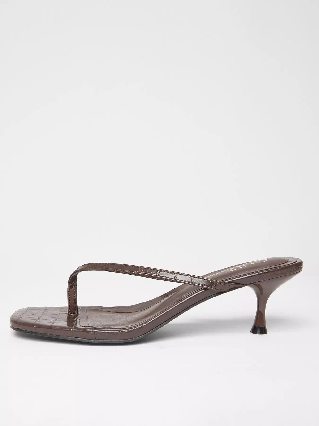- Brown - Dark brown - Chocolate brown - Heels - Shoes - Footwear - Low heels - Short heels - Open toe - Square toe - Toe thong - Toe post - Leather - Faux leather - Pu - Going out - Night out - Wide fit - Holiday - Birthday outfits - Date night - Date outfits- Lining: Textile/Other