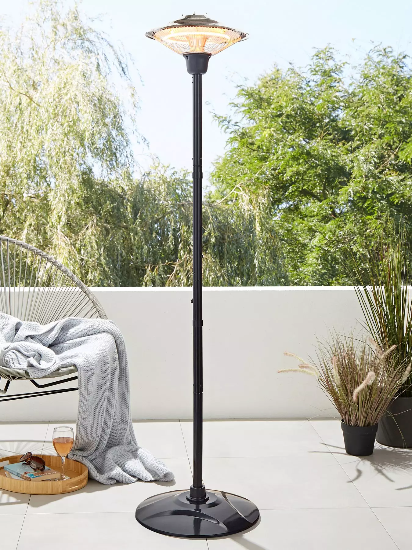 Coral 1500w Floor Standing Patio Heater in Silver. 42cm diameter cover. Halogen heating element Outdoor Use Only. IP34 Rated. Features Pull-Swith On/Off control. Tip over safety switch. Heat distribution 12m2- Depth: 1960 MM