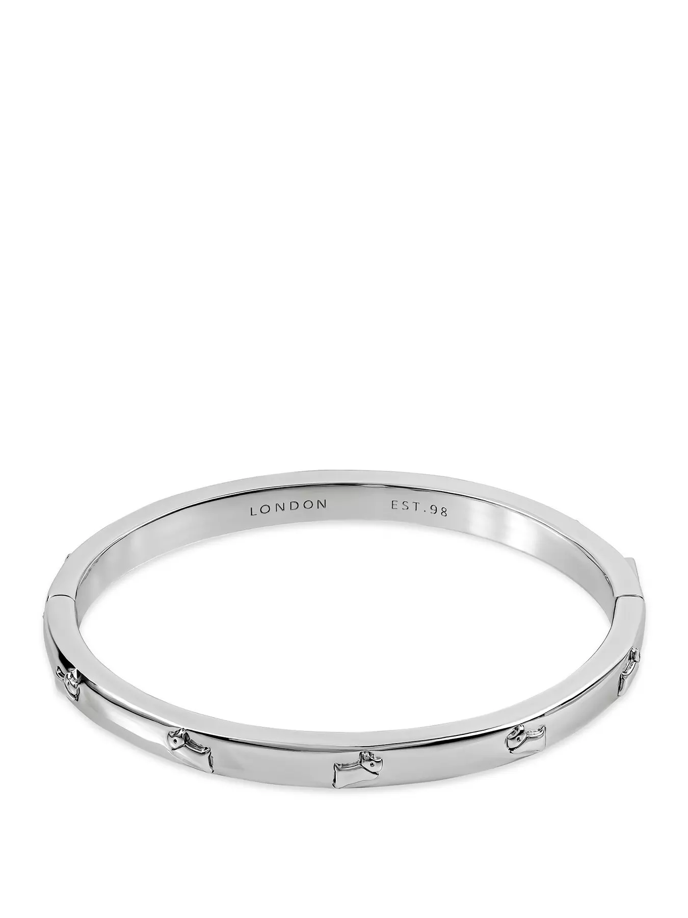 Radley Silver Plated Jumping Dog Bangle. A sleek and timeless accessory, featuring a raised Radley dog design that circles the wrist in delightful detail. Crafted in polished silver plating, it's finished with a secure push-button clasp for ease and comfort. Etched on the inside with ‘EST . 98 & LONDON' for a meaningful touch. Presented in a beautiful Radley London gift box, perfect for gifting or keeping close.- Depth: 2 MM