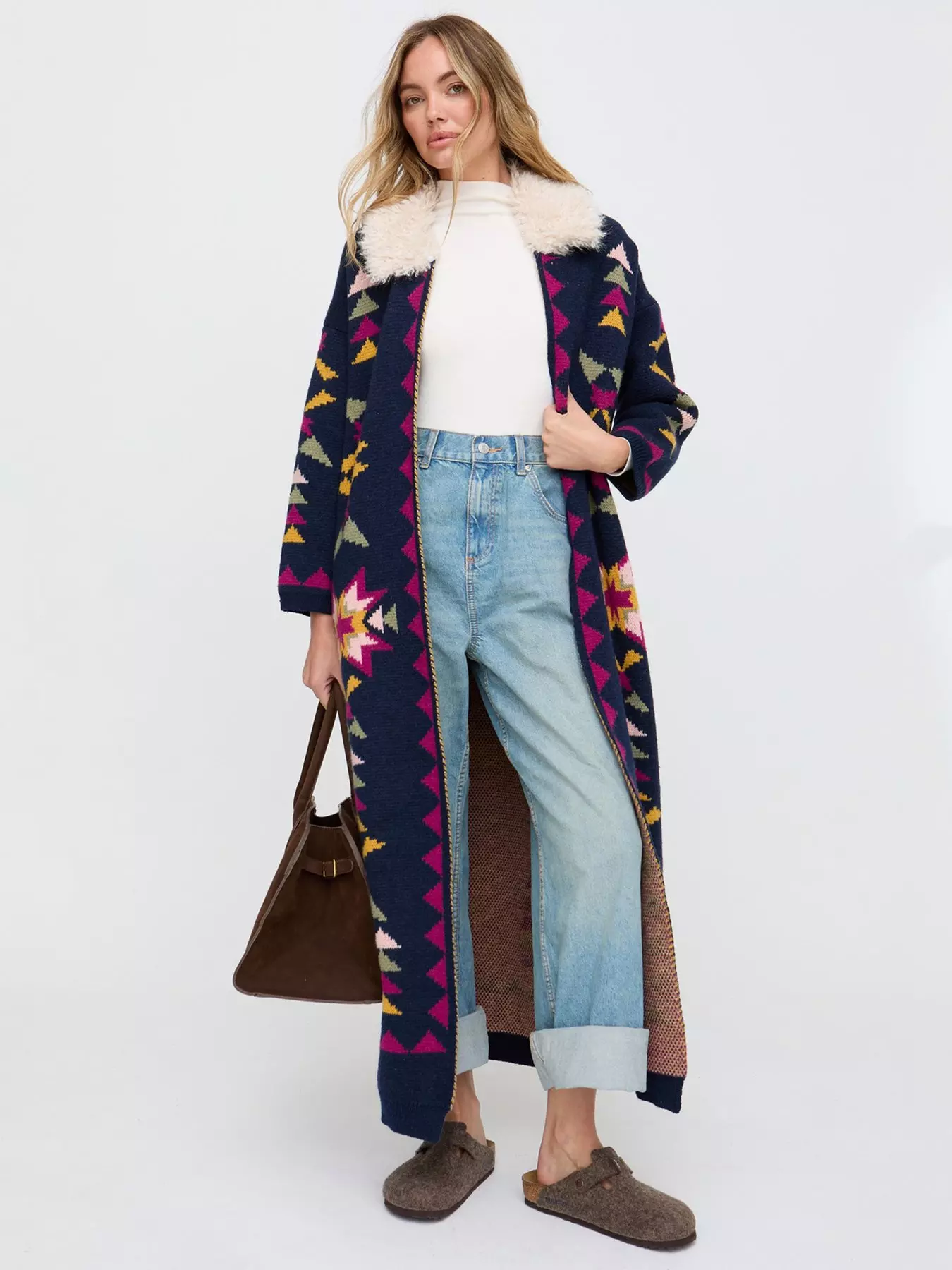 RaffyaCathy Jacquard Long Line Cardigan In Navy