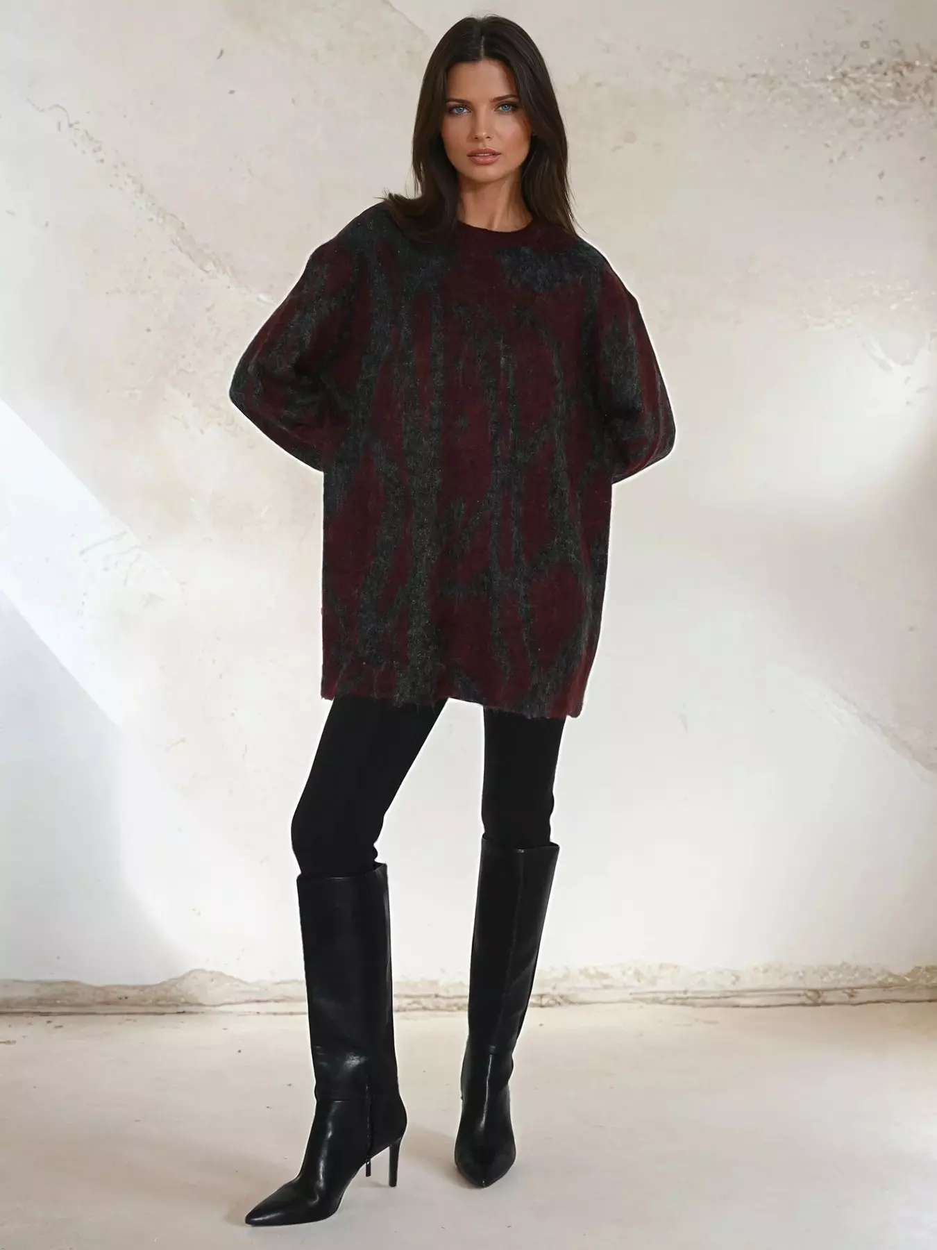 Elevate your style with the Maya jumper dress, a versatile piece that seamlessly blends comfort and fashion. Crafted from brushed lightweight yarn, this short tunic features a striking abstract jacquard pattern in charcoal and dark red. The crew neck and long sleeves provide a flattering silhouette, while the short length offers versatility for layering or wearing as a dress. Designed with a relaxed fit, the Maya jumper dress ensures effortless elegance and all-day comfort. Perfect for any occasion, this tunic is a must-have addition to your wardrobe.The model wears a size UK 10.