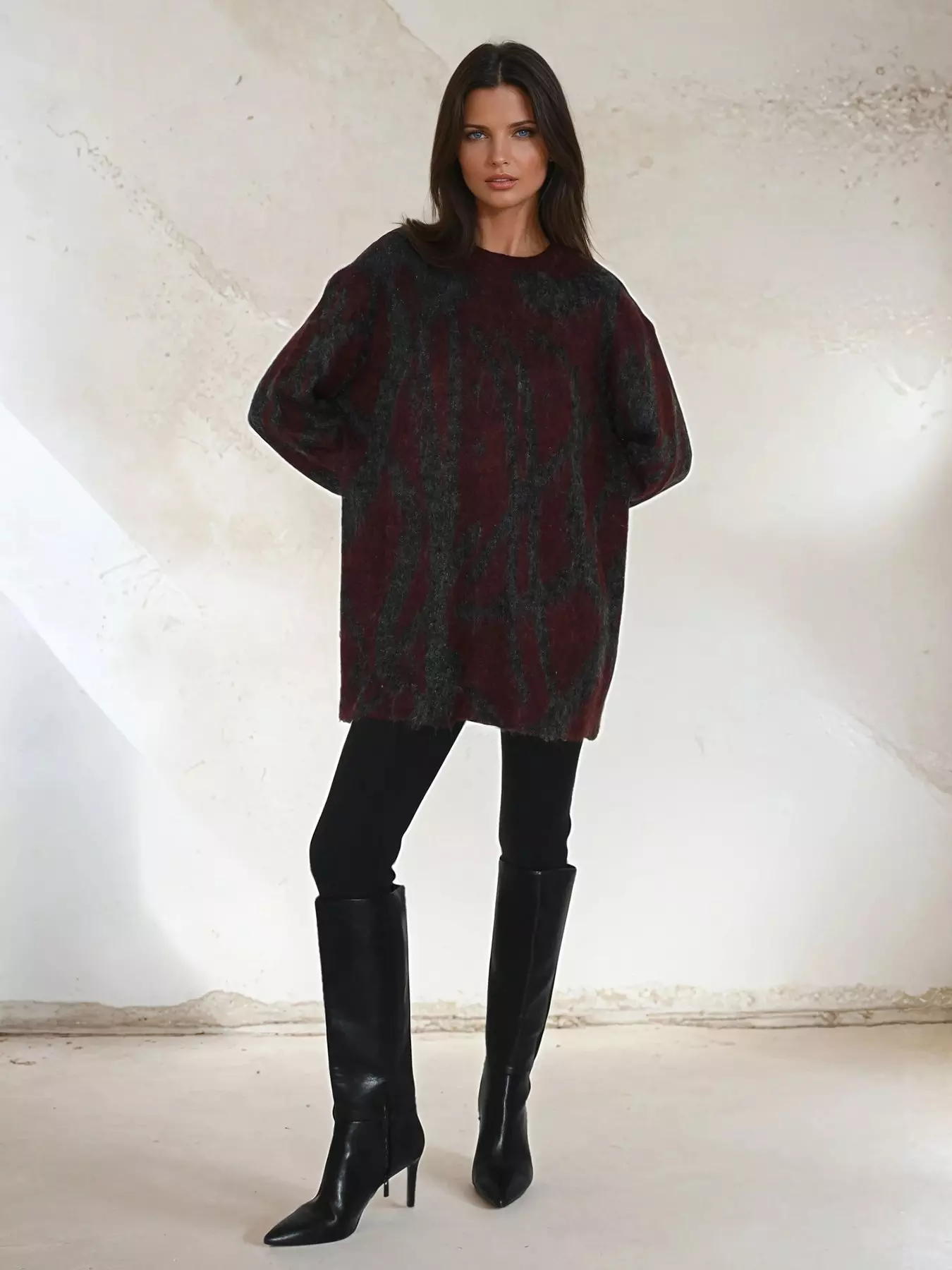 The Maya Cardigan is an essential layering piece that combines comfort and style. This oversized boxy cardigan features a high neck and zip closure, providing both warmth and a modern silhouette. The long sleeves and brushed yarn ensure a cosy fit, while the striking abstract jacquard pattern in charcoal and taupe brush stripes adds a touch of sophistication. Perfect for layering over your favourite outfits, this cardigan is a versatile addition to your wardrobe, effortlessly blending practicality with contemporary fashion.The model wears a size UK 10.