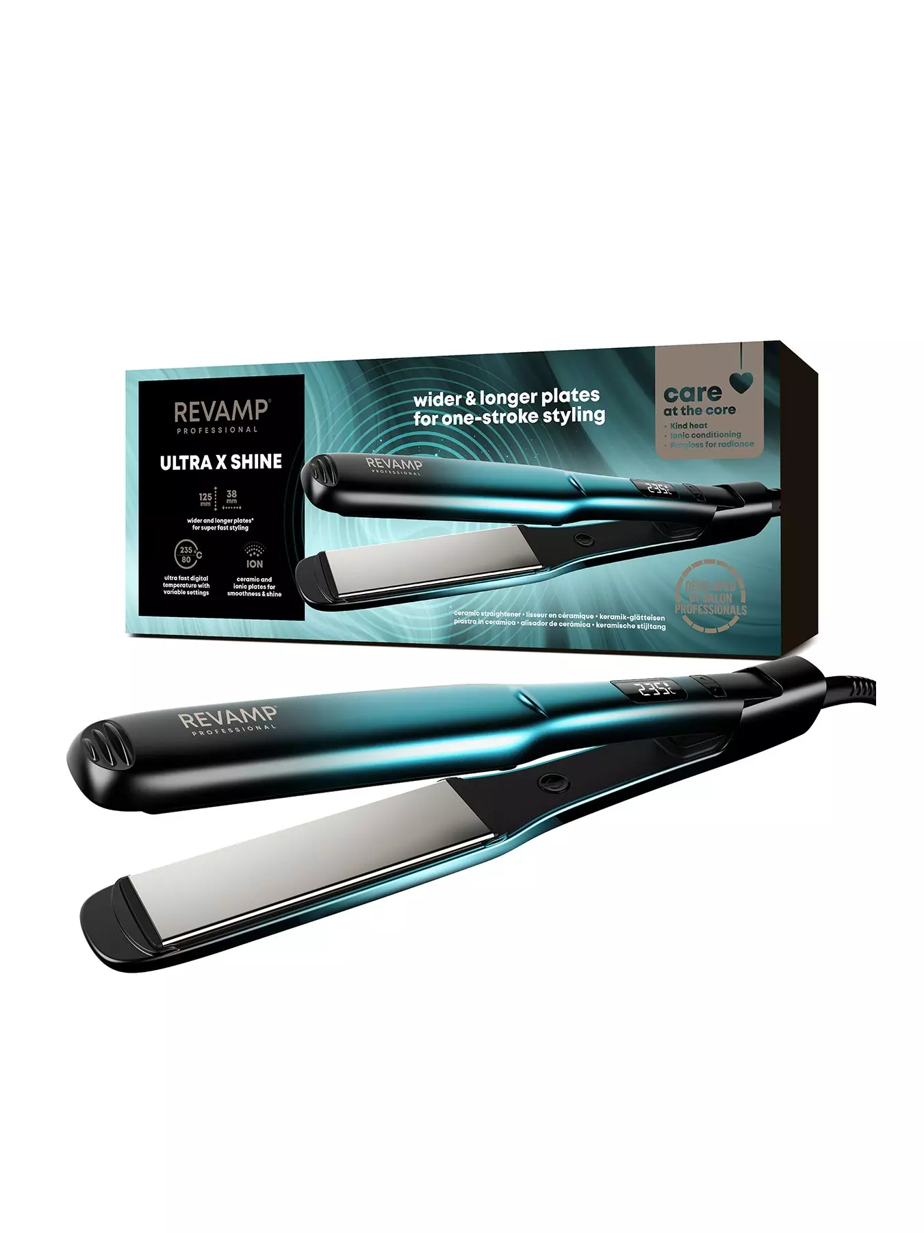 Save time and create stunning hairstyles with the REVAMP Wide Ultra X Shine Ceramic Hair Straightener. The ceramic ionic cushioned floating plates are extra-long and wide to effortlessly create lasting, beautiful looks while styling larger sections of hair at once. Offering adjustable heat settings from 80ºC to 235ºC, youll have complete styling control for all hair types. Infused with Progloss™ super smooth oils to ensure ultimate smooth results. Includes a 60 minute automatic shut-off, a temperature lock and a silicone heat-resistant mat.- Accessory List: Silicone heat resistant mat
