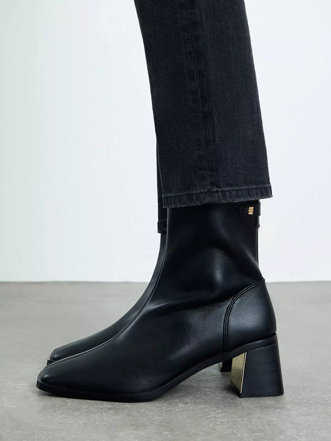 Faux leather fabric,Block heel,Square toe,Gold branding detail,Zip fastening,Heel height: 6cm- Faux leather fabric