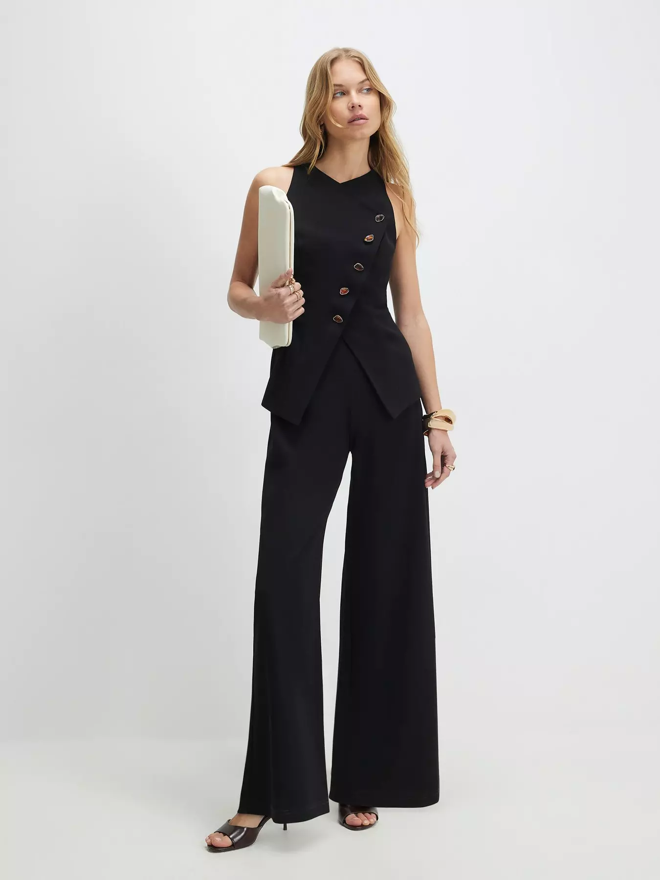 Collarless,Sleeveless,Wide leg,Button fastening- Collarless