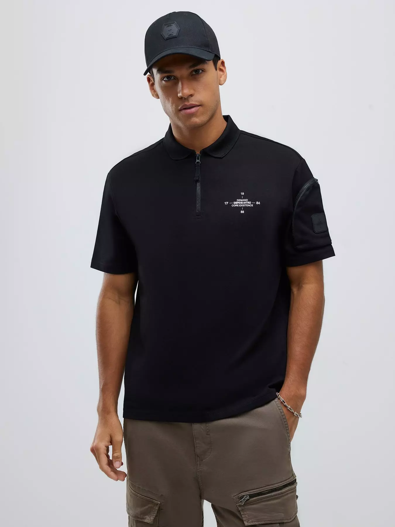 Regular Fit,Polo collared,Graphic print,Quarter zipped,Zipped arm pocket,Arm badge,Short sleeves- Regular Fit