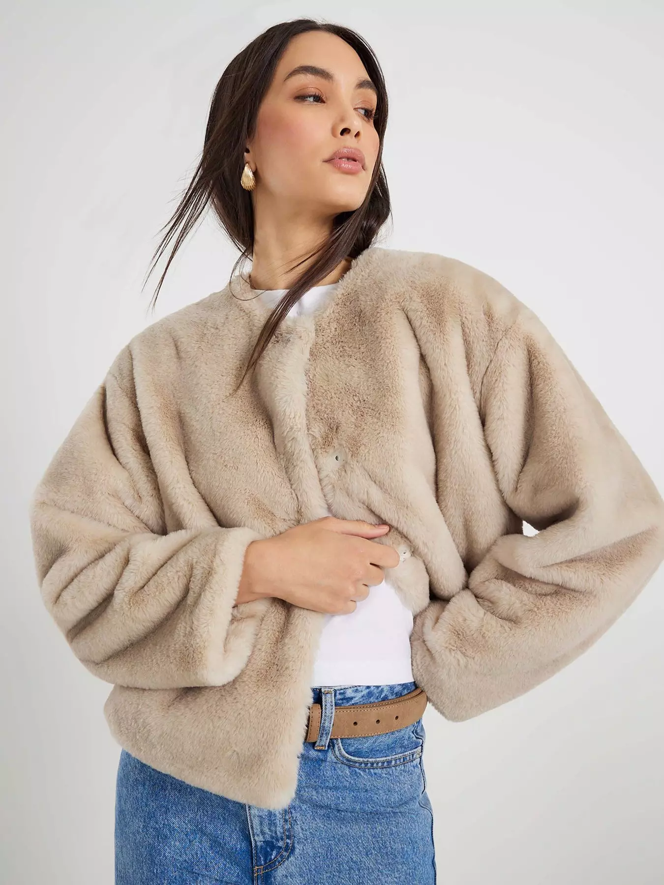 Faux fur,Round neckline,Long sleeves,Neckerchief Detail- Faux fur