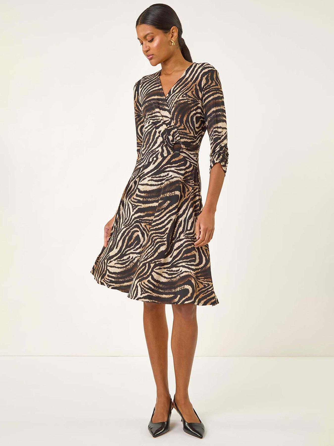 • outfit image of roman-animal-print-ring-detail-stretch-dress-natural