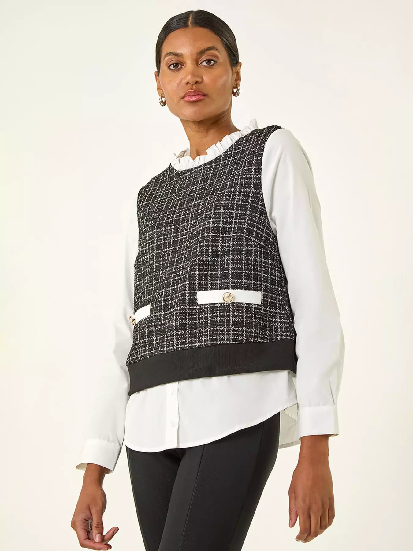 Step up your Autumn/Winter wardrobe with this sleek 2 in 1 top and shirt duo. The boucle stretch top comes with a high neckline and chic finishing touches for a sophisticated look. Paired perfectly with the attached shirt featuring long sleeves and button details this top finishes at the low hips for a modern silhouette. Rock this stylish piece with jeans and ankle boots for an effortlessly chic ensemble.- Material Content: 85% Polyester 10% Cotton 5% Elastane Lining: 100% Cotton