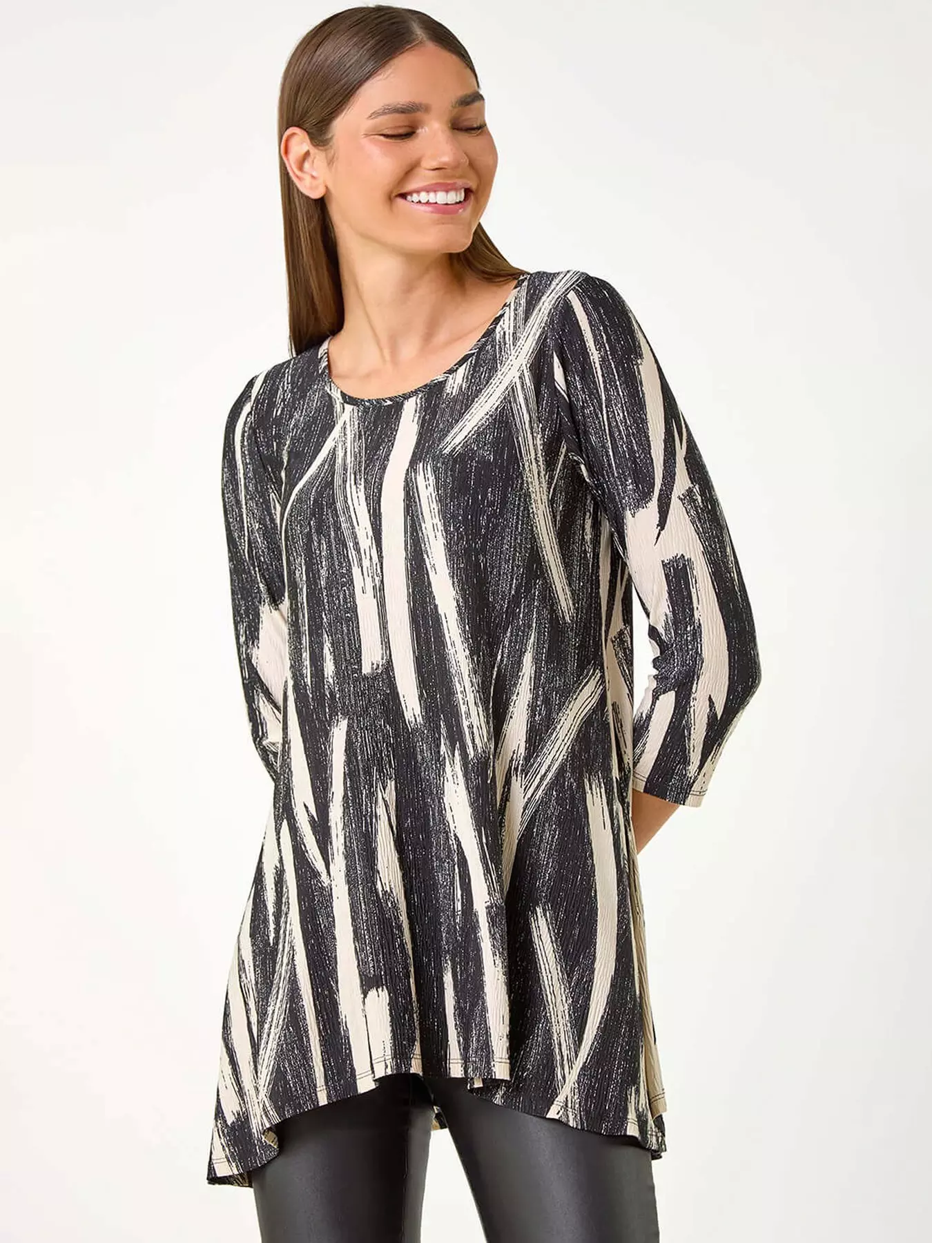 Add an artistic touch to your Autumn and Winter wardrobe with this playful brush print tunic top. Featuring a modest neckline, this tunic boasts elegant 3/4 length sleeves adorned in linear brushstrokes for an artistic flair. The feminine hanky hem finish adds a stylish touch to this comfortable jersey stretchy plisse fabric top, perfect for the season. Dominate the cold in style by pairing it with jeggings and boots for a casual day out!Material & Care