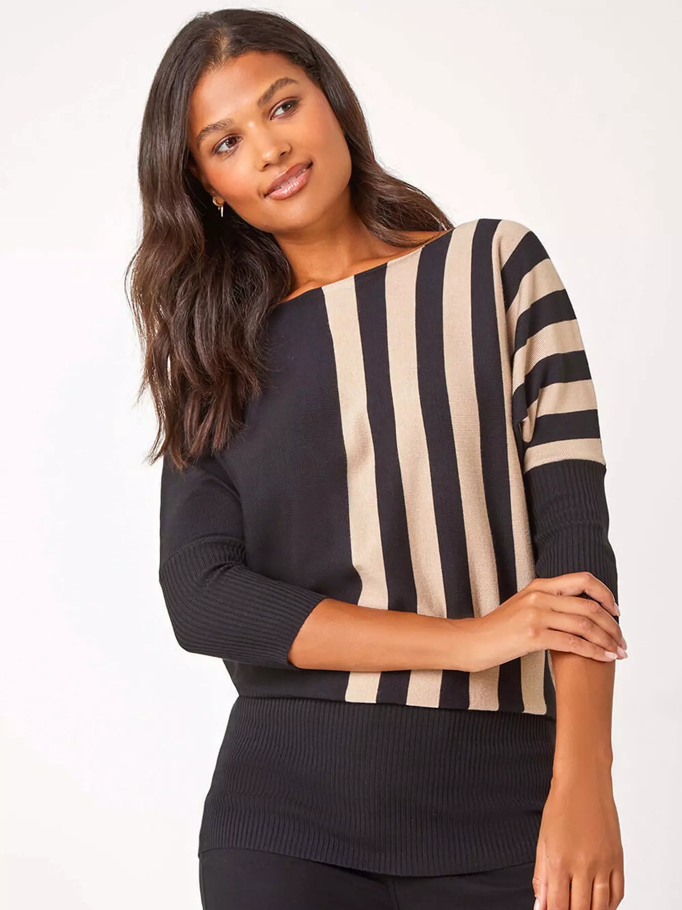 Step out in style this Autumn Winter with our trendy contrast stripe knit jumper. Crafted from a cosy knitted jersey fabric, this jumper boasts a flattering round neckline and trendy 3/4 length drop shoulder sleeves. The unique colour block style creates a modern look, perfect for all-day wear. Pair with a classic denim jacket, your favourite jeans and boots for effortless vibes this season!Material & Care