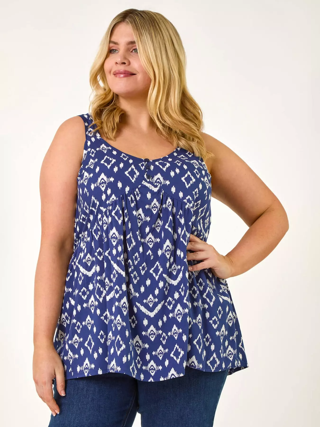 E.A.N: 5 0 6 3 5 6 6 2 0 0 2 6 5Roman Curve Ikat Print Woven Vest Top - Navy
