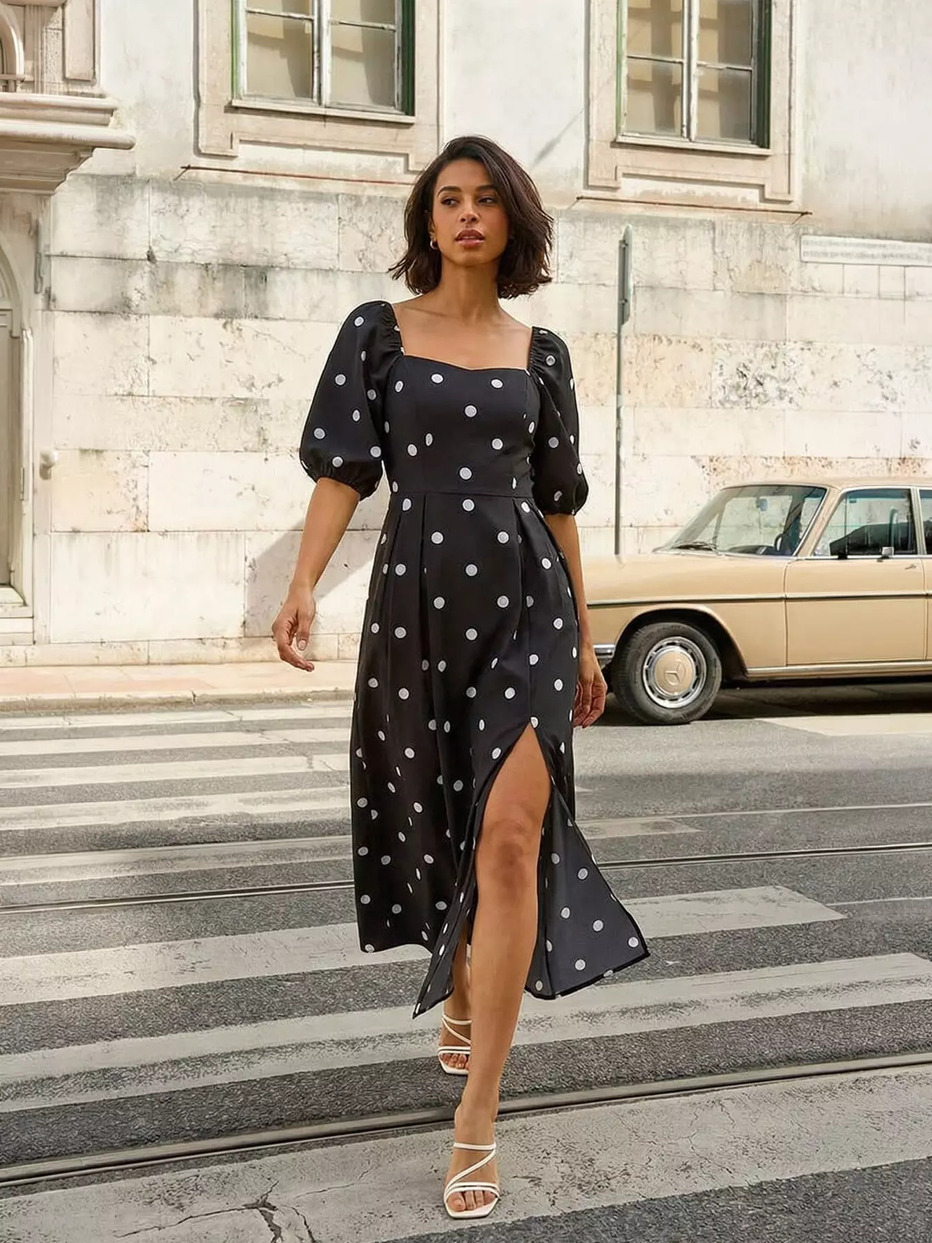 Get spotted in style this season with our Dusk polka dot midi dress. Featuring a chic square neckline and playful short puff sleeves this dress is cut from a comfortable woven fabric with a fun polka dot print. Falling elegantly at midi length in an a-line shape it's perfect for any occasion. Pair with a denim jacket and wedged heels for the perfect Spring Summer look!- Additions: Short Puff Sleeves