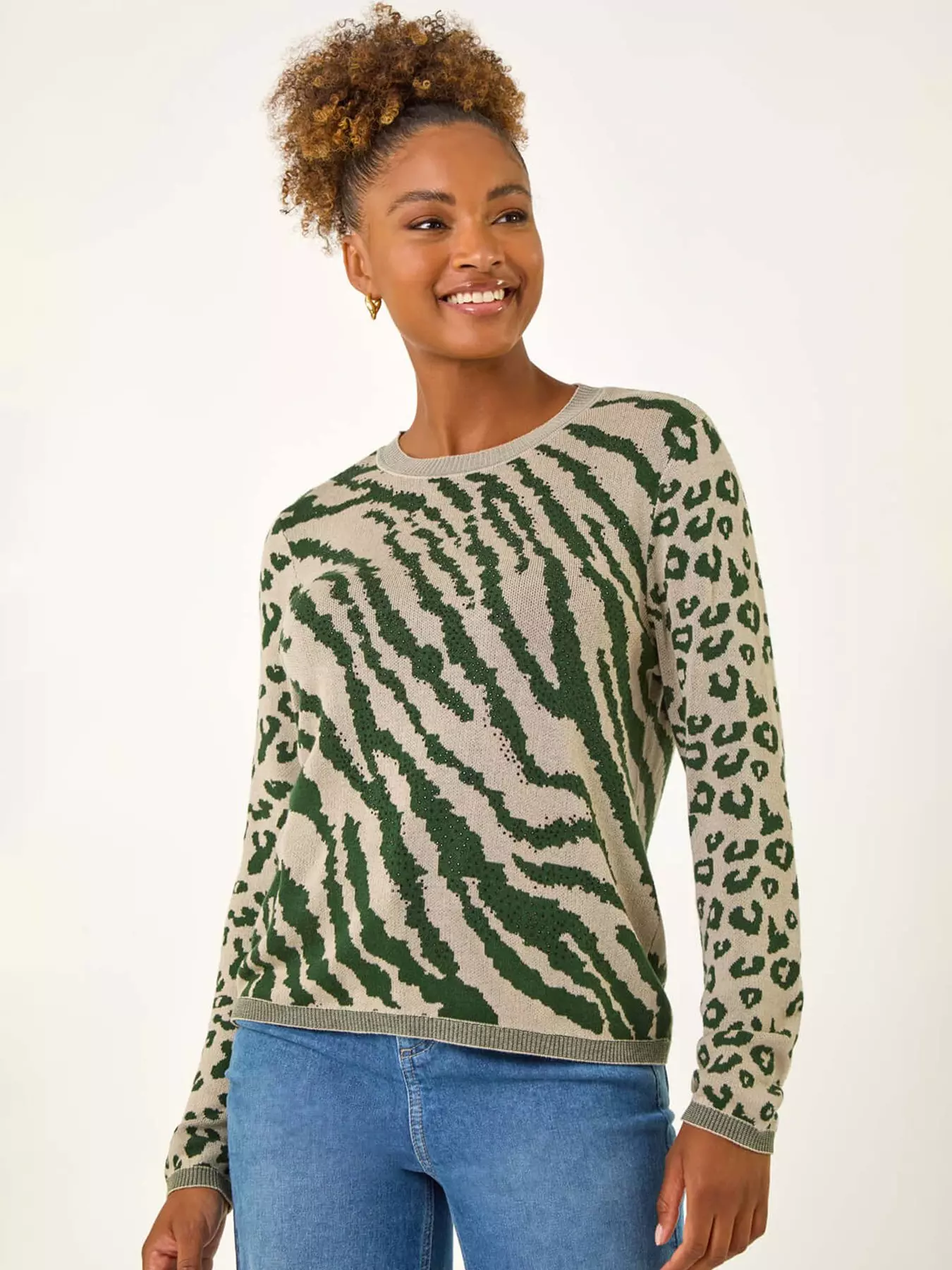 Take a walk on the wild side with this embellished animal knit jumper. Stay snug and stylish with the classic crew neckline and long sleeves of this fierce jumper. Cut from a cosy mix of knitted fabrics the standout animal print adds a touch of glamour. Pair with wide-leg trousers and ankle boots for a fashion-forward outfit!- Material Content: 63% Viscose 37% Cotton