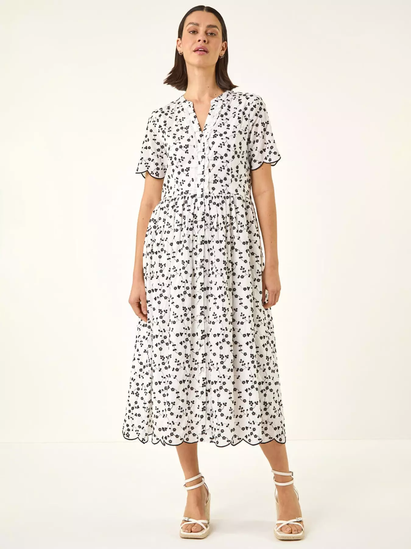 Make a stylish statement in this charming embroidered midi dress. Crafted with intricate detailing and stylish buttons this dress features a flattering V-neck and chic short sleeves. The fit and flare shape adds a touch of femininity to the overall look. Perfect for Spring/Summer pair this dress with sandals and a denim jacket for a chic and effortless ensemble.- Material Content: 100% Cotton Lining: 100% Cotton