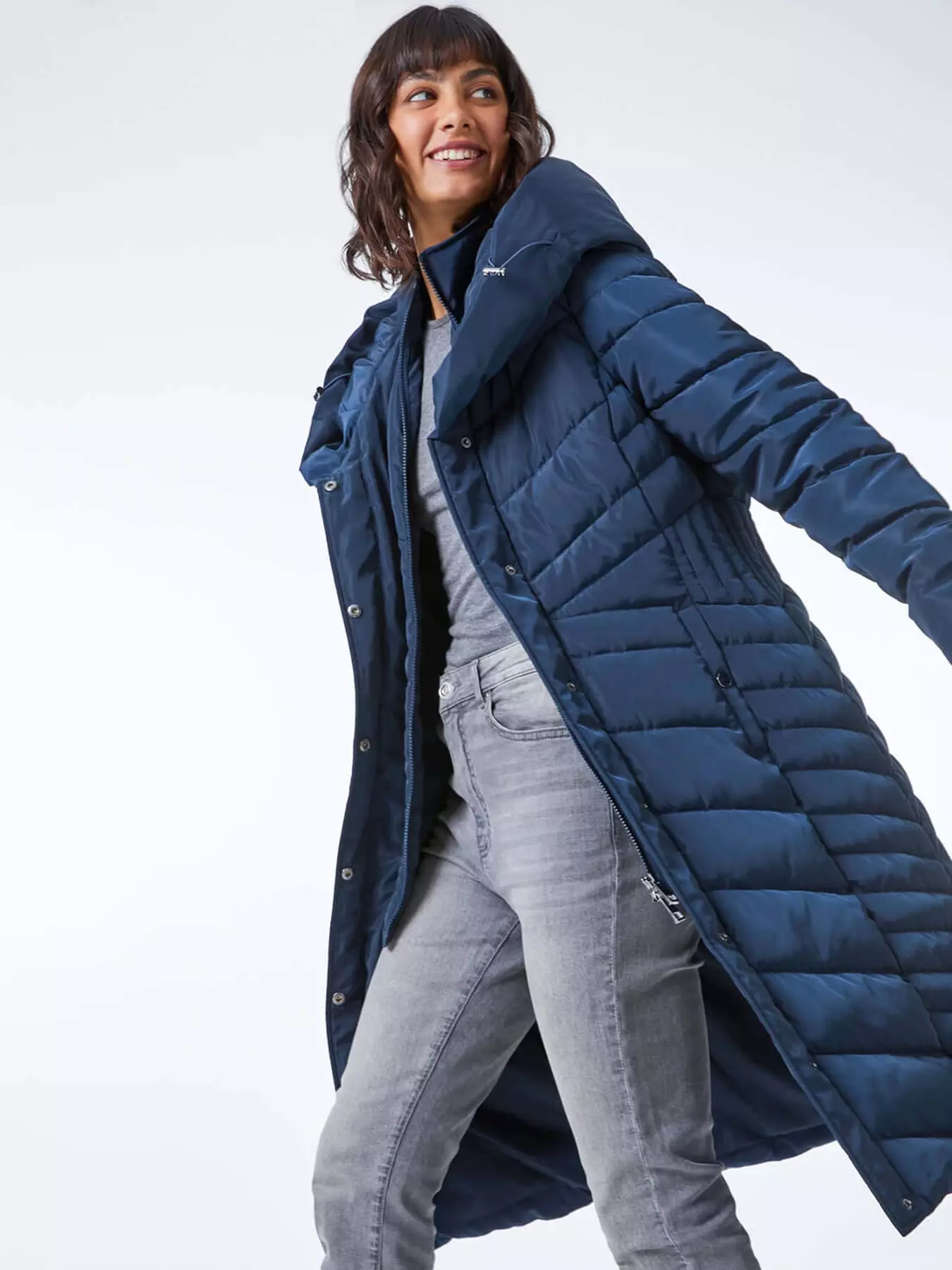 The ultimate Winter staple, this mid length hooded coat will see you through to Spring. It features a mock inner lining and is adorned by a cosy quilted fabric. The duvet style hood and funnel neck provide both warmth and coverage. It features long sleeves, cuffs and practical side pockets. Throw this over any every day outfit to protect yourself from the great outdoors!Material & Care