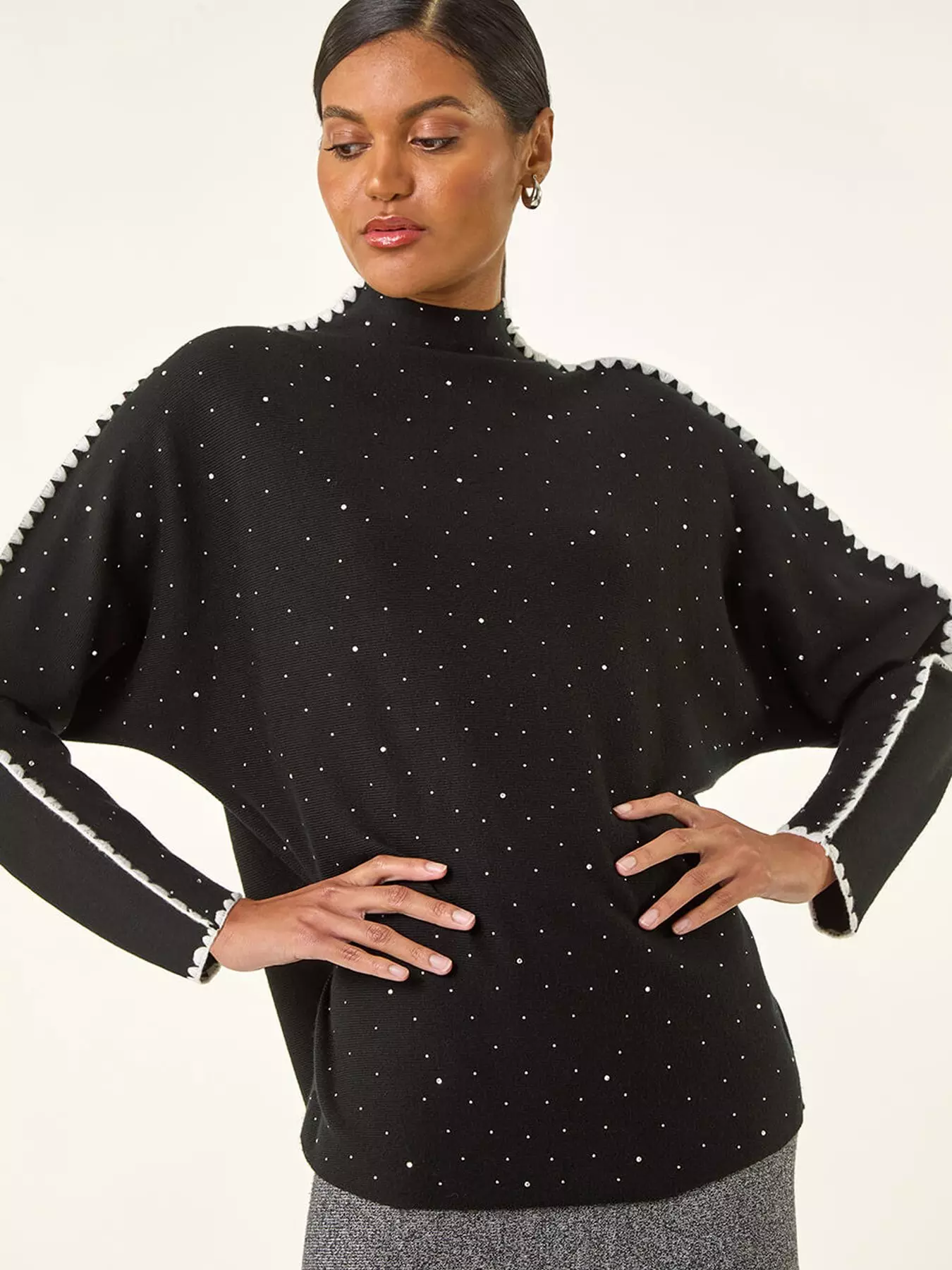Stay cosy and chic this Autumn/Winter season with our blanket stich hotfix jumper. This stylish knit features intricate detailing with blanket stitch accents and hotfix embellishments. The long sleeves and high neck provide extra warmth while adding a touch of elegance. Pair with jeggings and ankle boots for the perfect casual yet fashionable look!- Material Content: 75% Polyamide 25% Viscose