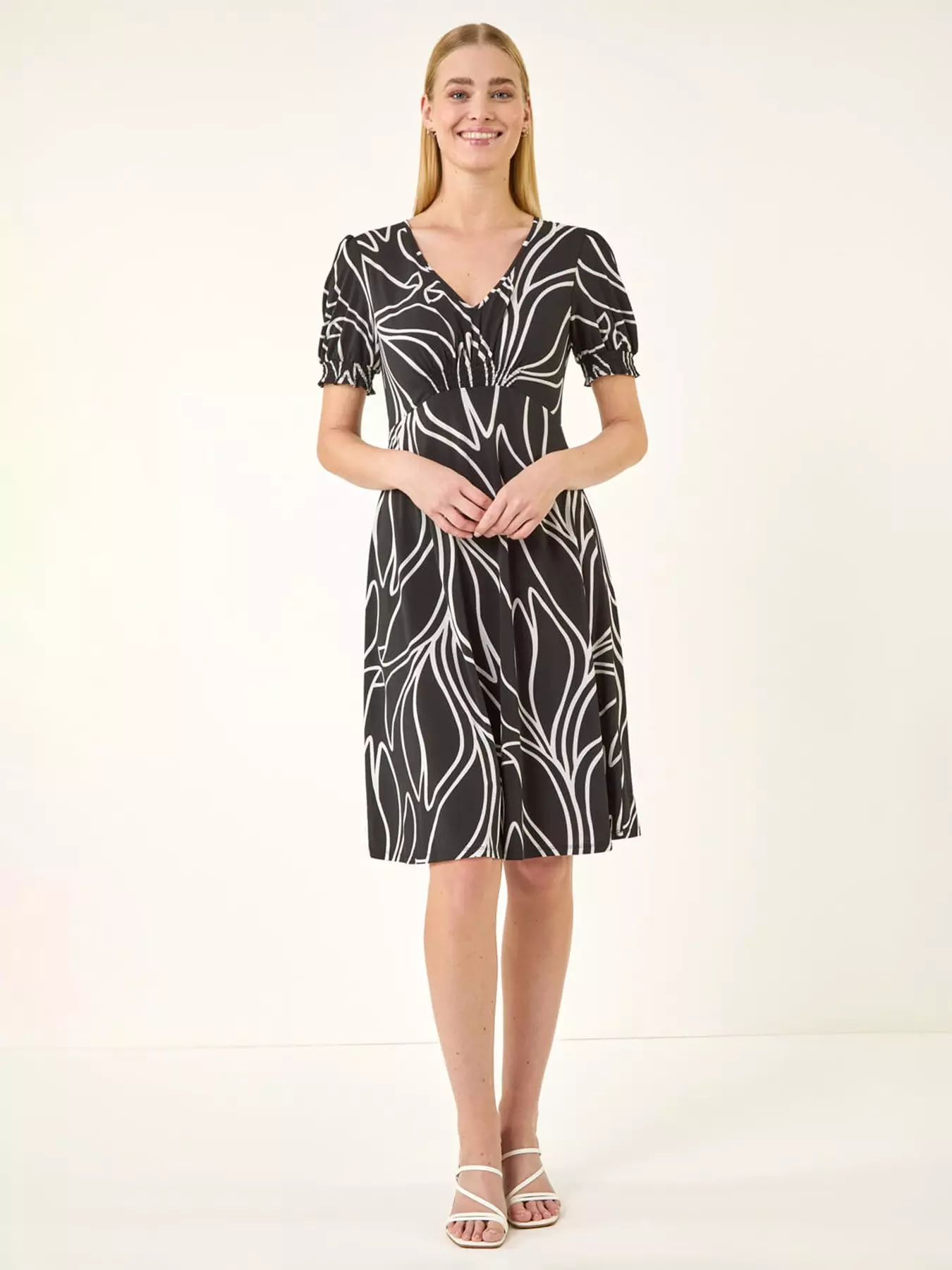 Stand out this season in this beautiful leaf print midi dress. Featuring an abstract leaf pattern this dress boasts a flattering fit and flare shape with gathered detail at the waist. The v-neckline and short sleeves with elasticated cuffs add a touch of femininity to the look. Perfect for warmer days style this dress with sandals and a denim jacket for a chic and effortless outfit.- Additions: Gathered Detail