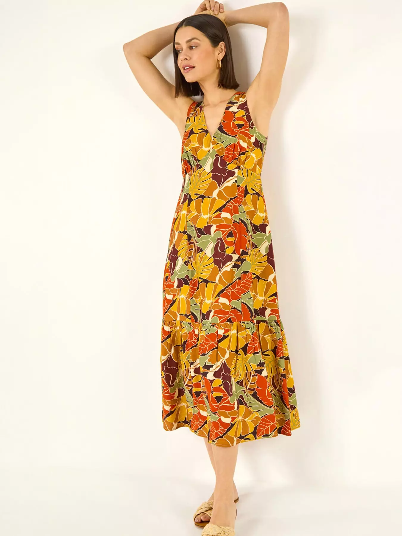 Prepare to make a statement in this leaf print tiered midi dress the perfect choice for your Spring and Summer wardrobe. Featuring a flattering v-neckline and sleeveless design this dress exudes effortless elegance and style. Style with a denim jacket and wedged heels for the ultimate look!- Material Content: Machine Washable