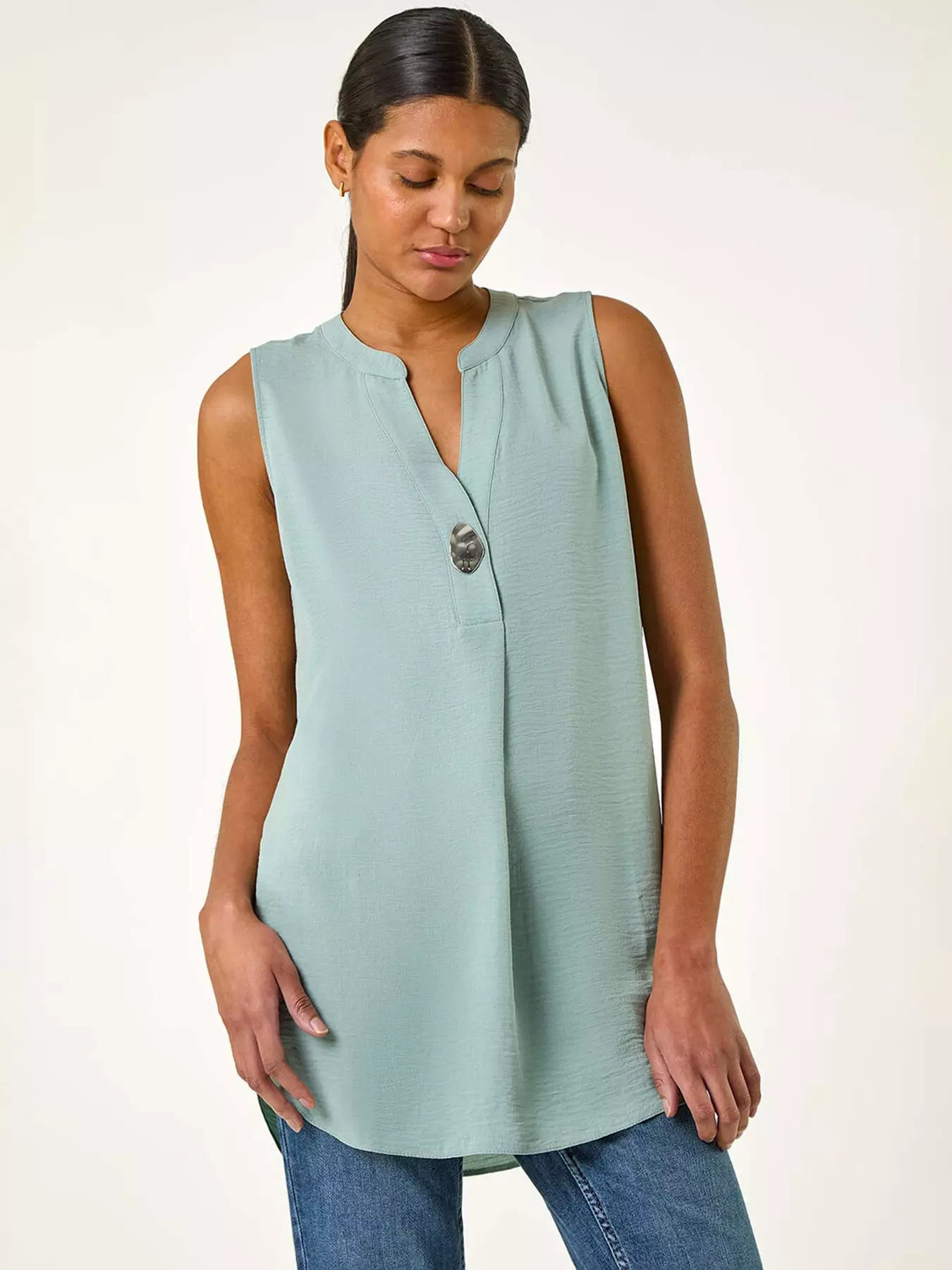 Elevate your Summer wardrobe with this longline vest featuring a stylish v-neck and a statement large button detail at the neckline. The sleeveless design and tailored front pleat detail create an elegant silhouette. Perfect for warm days this flattering top can be dressed with tailored trousers and heels for a sophisticated look.- Material Content: 100% Polyester