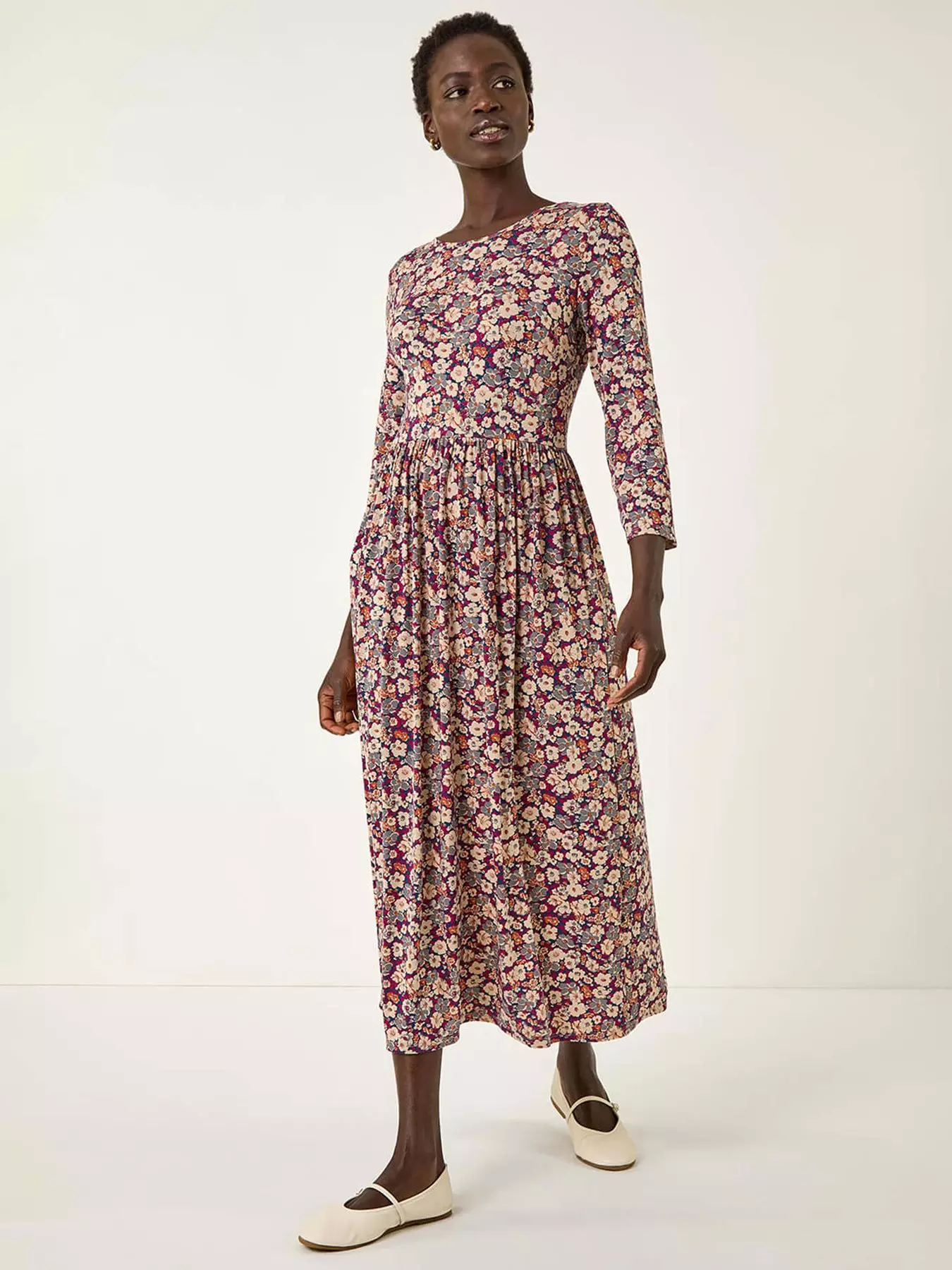 Feel fabulous in florals with this versatile round neck midi dress. Crafted from a soft stretchy jersey fabric this dress features a stunning multi-floral print perfect for the Autumn/Winter season. The long sleeves and side pockets add both style and practicality to this wardrobe essential. Finished with flattering gathers at the waist this dress is perfect for day to night wear. Complete the look with tights and ankle boots for a chic and comfortable outfit.- Material Content: 96% Viscose 4% Elastane