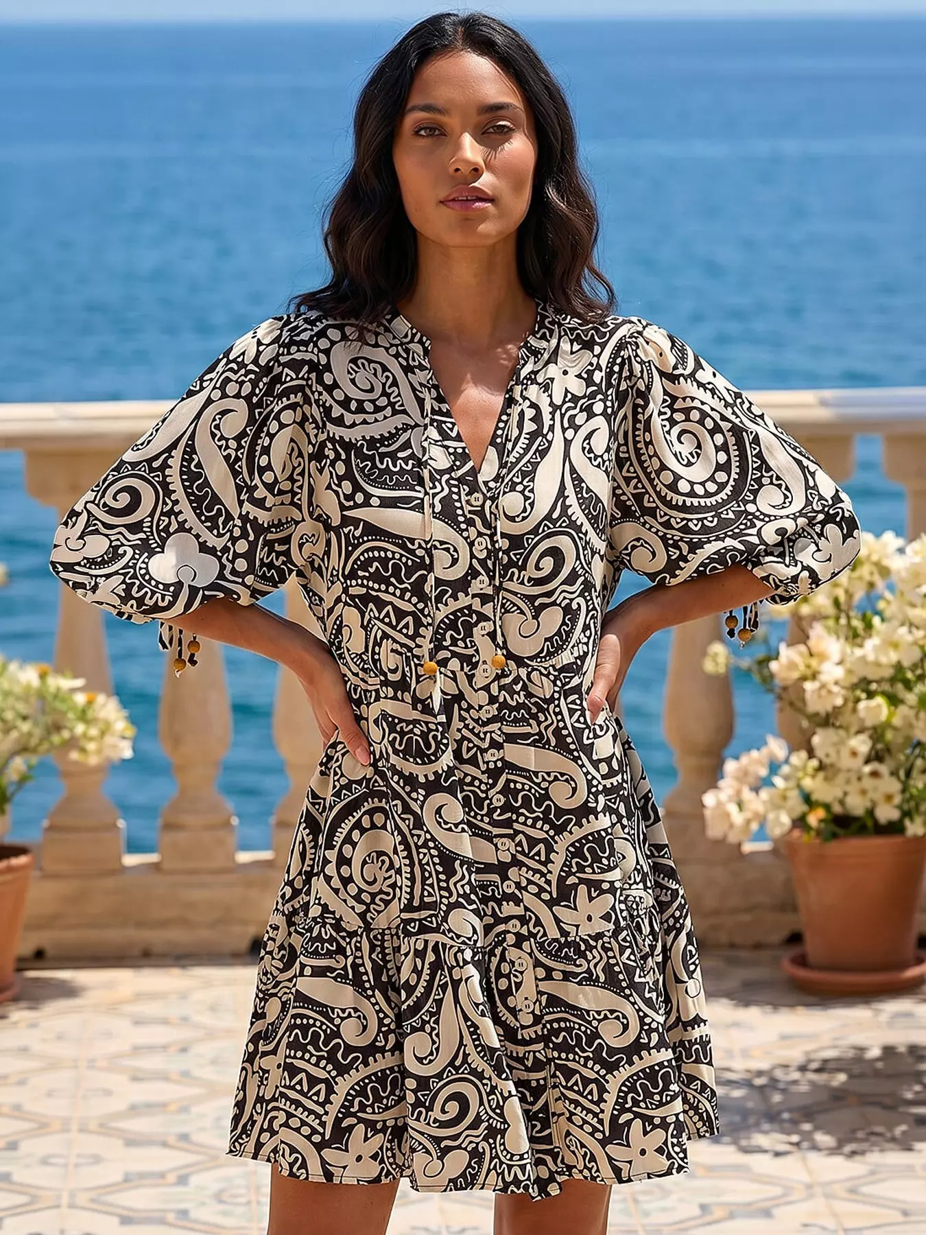 Embark on your style journey with this Petite abstract print smock dress. Perfect for the Spring Summer season this stylish smock dress features a classic v-neckline and charming button-through details on a comfortable woven fabric. The abstract print adds a touch of personality to your look while the 3/4 length sleeves keep you feeling fabulous. Finish off your outfit with a denim jacket and wedge heels!- Additions: 3/4 Length Sleeves