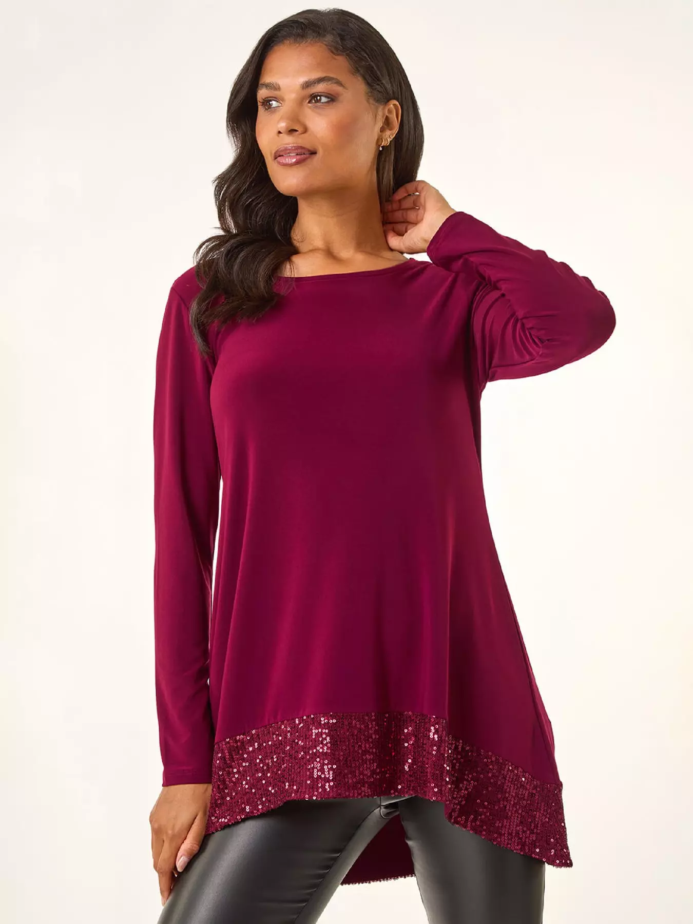 Roman Sequin Hem Tunic Stretch Top - Burgundy