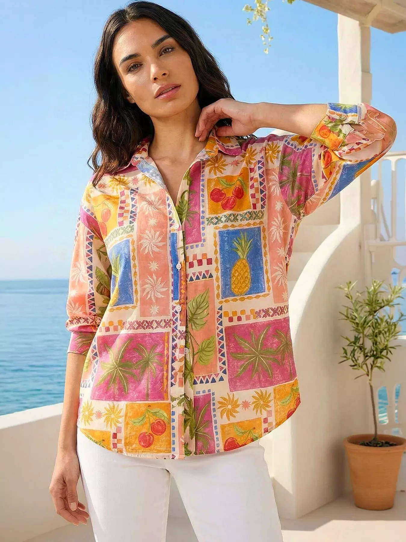 Get ready to embrace the tropical vibes with this vibrant cotton shirt. Covered in a bold patchwork print this shirt features a classic collar and front buttons for easy wear. Perfect for the Spring Summer season this shirt is ideal for adding a pop of colour to your wardrobe. Style with shorts for a complete look!- Additions: Length: Approx. 78cm