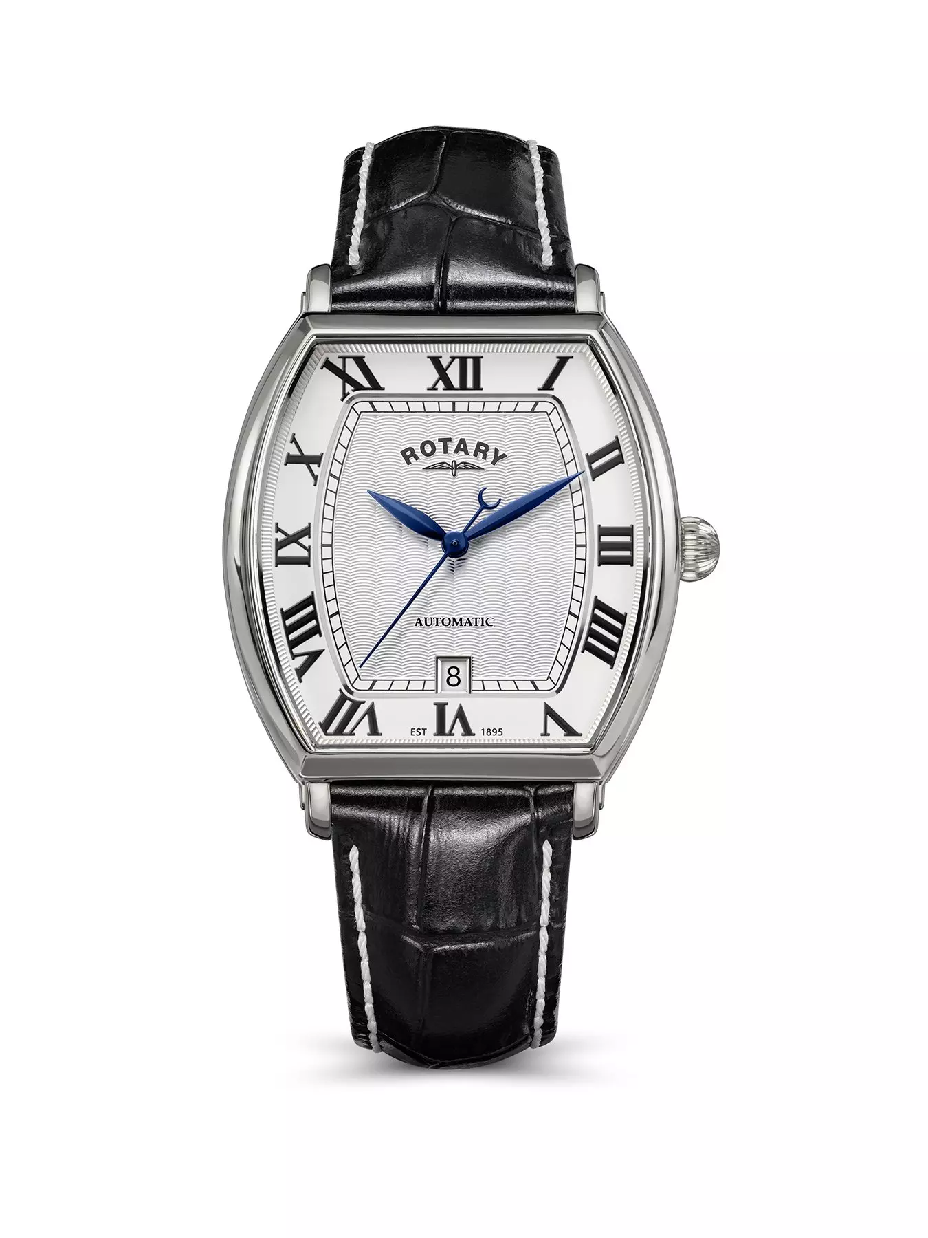 This Rotary 1895 offers a refined interpretation of classic watchmaking, built around a 36mm 304L stainless steel tonneau case with a 46mm lug-to-lug for a comfortable, traditional fit on the wrist. Its guilloche white dial delivers crisp elegance, framed by bold Roman numerals and protected by curved sapphire glass that adds depth and clarity from every angle.Powered by the reliable Miyota 8215 automatic movement, this Rotary 1895 blends mechanical assurance with understated style. The exhibition caseback reveals the movement in motion, reinforcing the watch's focus on heritage craftsmanship. A black leather strap completes the design, giving it a smooth, refined presence on the wrist. With 50m water resistance, it's built to handle everyday wear with ease.