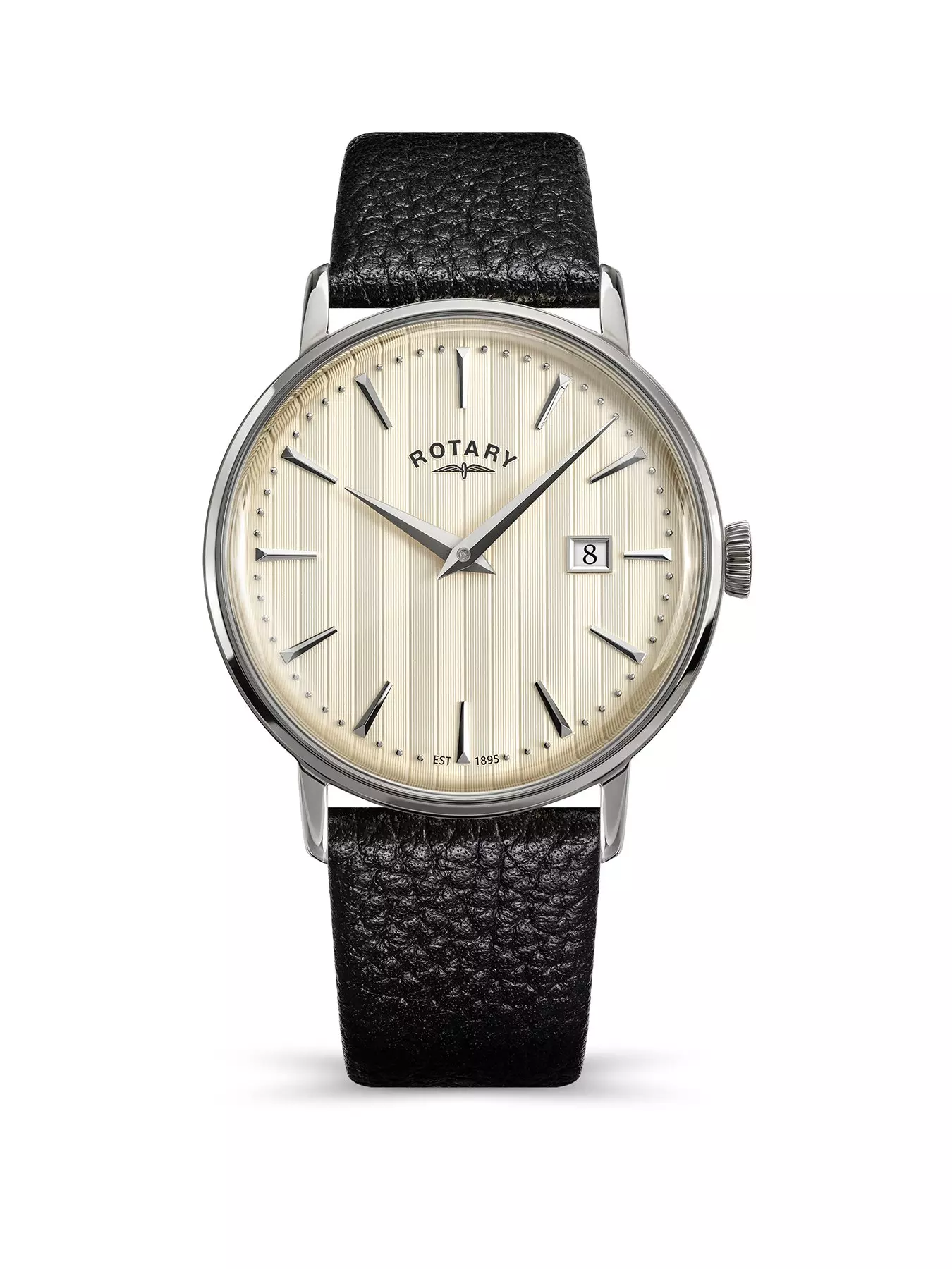 This Rotary 1895 offers a clean, elegant take on everyday wearing, built around a 38.5mm case with a compact 45mm lug-to-lug and a slim 9mm profile. Crafted from 304L stainless steel, it pairs a classic silhouette with a refined cream slatted dial, shaped with a gentle curve that adds depth to the design. Applied indices and slim hands keep the display crisp and uncluttered, protected by mineral bubble glass that enhances its vintage character.Powered by a precise two-hand quartz movement, this 1895 delivers reliable timekeeping in a streamlined package. With 50m water resistance and a black leather strap, it balances everyday durability with a classic, dress-ready finish.