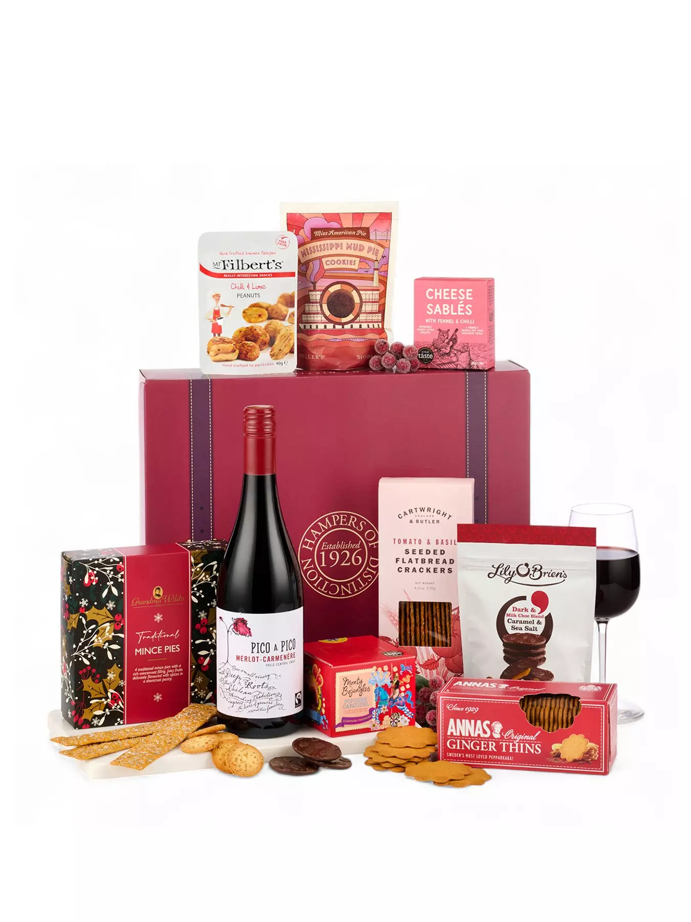 Rich, warm, and brimming with festive charm, The Redsleeves is a Christmas hamper that captures the heart of the season. Presented in a dark wicker-look gift box, it blends the elegance of fine red wine with an irresistible mix of seasonal indulgences.At its centre is a bottle of velvety Pico a Pico Merlot Carmenere - smooth, robust, and perfect for toasting with friends or unwinding on a winter's evening. The wine finds perfect companions in buttery mince pies, delicately spiced ginger thins, and decadent caramel-filled chocolates. For a savoury counterpoint, there are aromatic tomato & basil seeded flatbreads, fennel & chilli sables, and zingy chilli & lime peanuts. To finish, popcorn-studded truffles and chewy Mississippi mud pie cookies bring a touch of playful sweetness to every gathering.