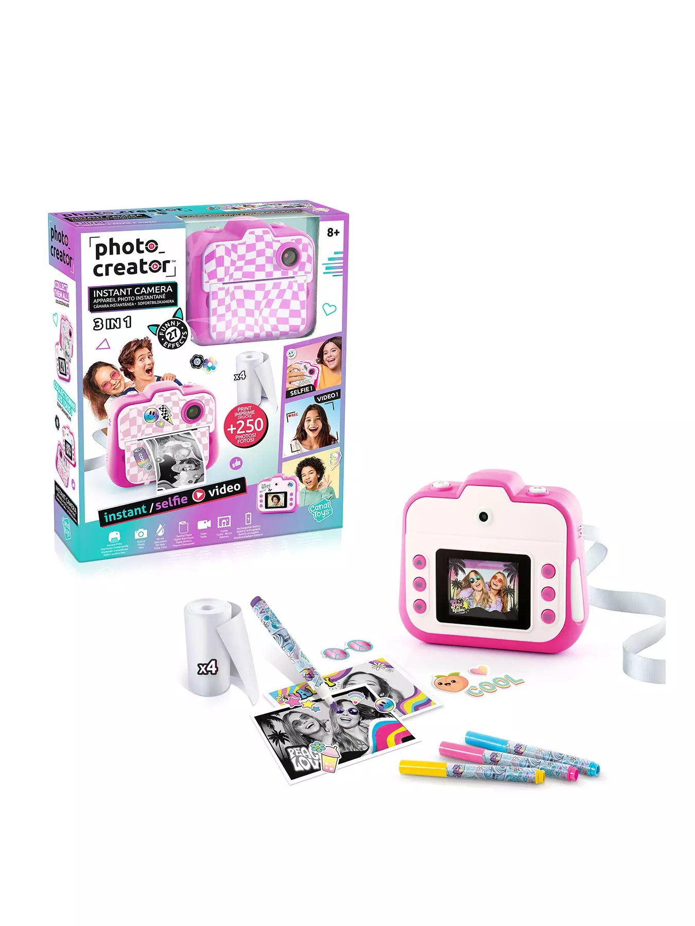 Create fun photo & video content, print & personalise 250+ instant prints & enjoy hours of fun with your friends with this stylish instant camera.The 12 megapixel digital camera is packed with cool features, 20+ fun photo filters & effects, a shutter timer perfect for group selfies, video recording, a rechargeable built-in battery, plus a selfie lens for easy selfie-snaps. Comes with 4GB micro-SD card, 4 paper rolls, USB charger cable also for downloading photos/videos. Plus, customise your prints with 4 colourful marker pens & fun stickers.