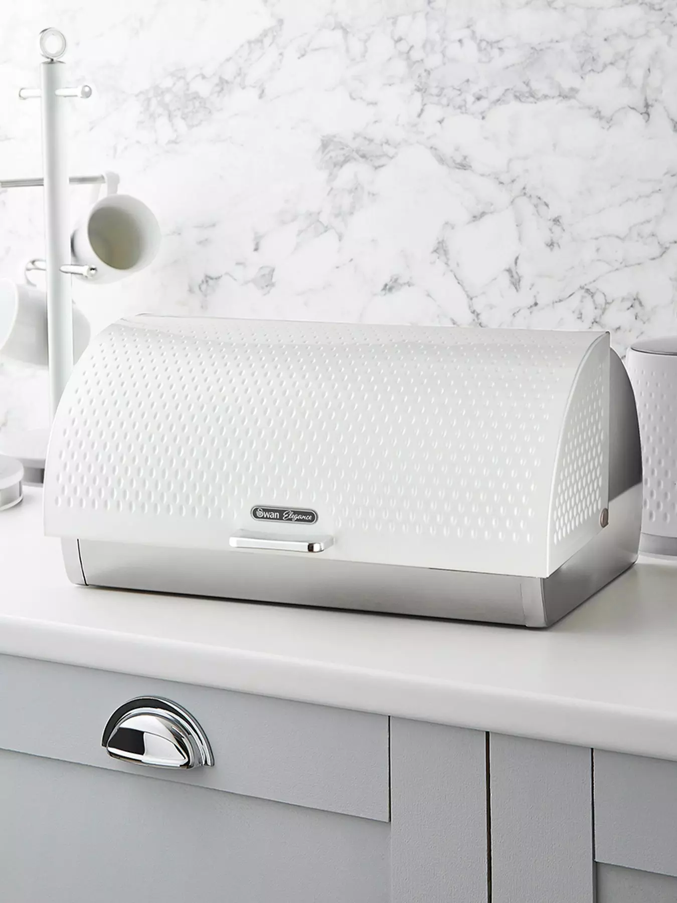 The Swan Elegance bread bin is the ultimate storage solution to keep your baked goods fresh and easy to access on your countertop. Featuring a roll top lid with large bar handle. The large 14 litre capacity means you can fit a variety of loaves, muffins, bagels, or crumpets at one time, which is perfect for those busy family homes. This large bread bin features ventilation holes at the back, which regulate moisture and facilitates airflow to prevent stale odours and keep your baked goods fresh for longer. The robust design is highly durable for everyday use, while the non-slip feet provide stability on your worktop. It's also easy to maintain, requiring a simple wipe with a damp cloth to clean. This Swan bread bin forms part of the Swan Elegance collection, which features a distinctive design that is perfect if you are looking to freshen up your kitchen decor.EASY ROLL TOP LID
