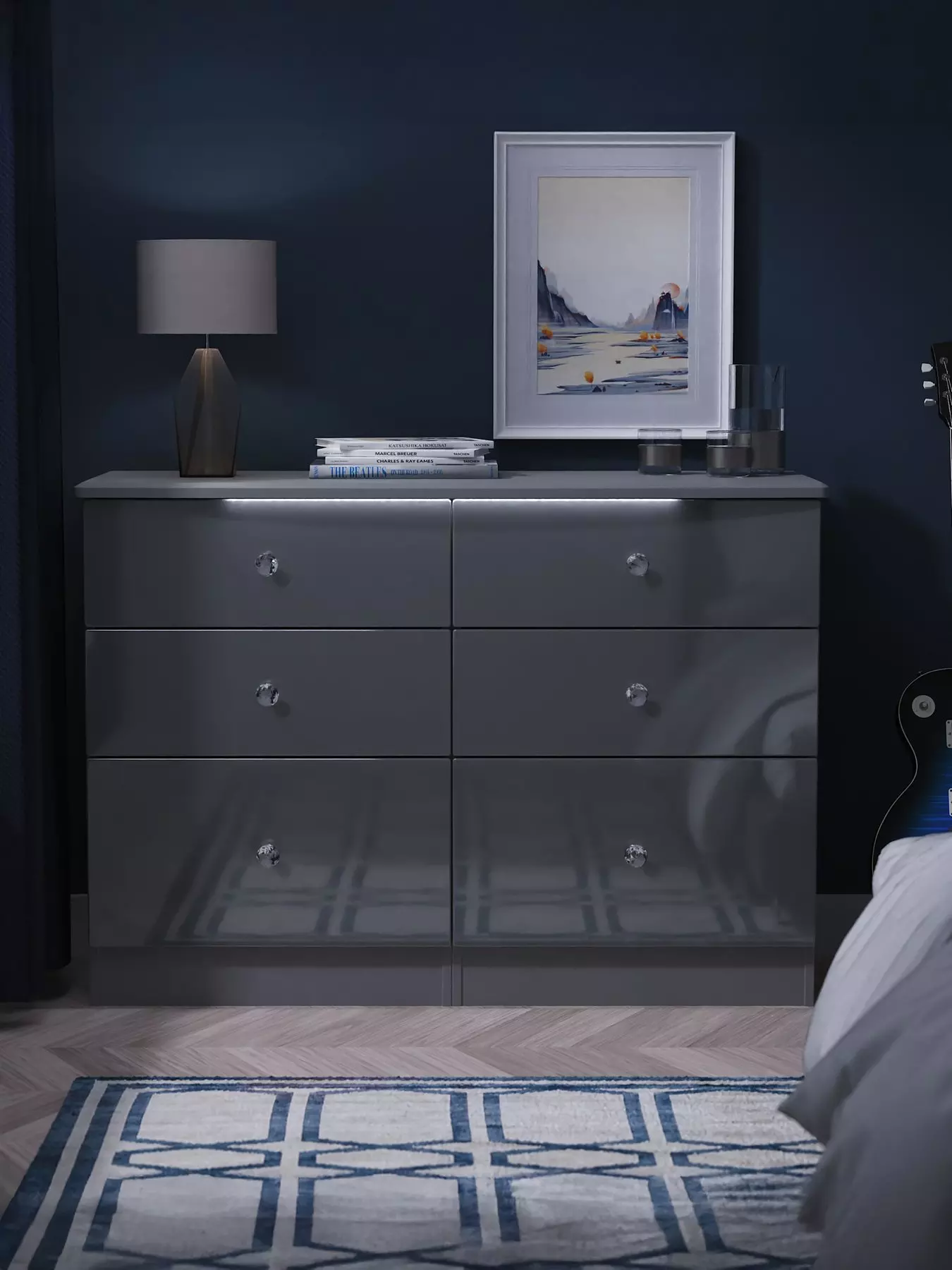 This double width 6 drawer chest of drawers is practical and stylish. Perfect for any home as a free standing storage unit. Light up your bedroom with the shiny style of the stunning Lumiere collection. A dazzling range of ready-assembled bedroom furniture featuring matt bodies and gloss finish doors/drawer fronts. With built-in lighting which illuminates the contents making everything much easier to find, even in the dark. All our furniture is made in the United Kingdom, to the highest quality. It is delivered direct to your location of choice by one of our two man delivery teams, and comes fully assembled (although legs may be removed to prevent damage in transit).- Assembly: Ready Assembled