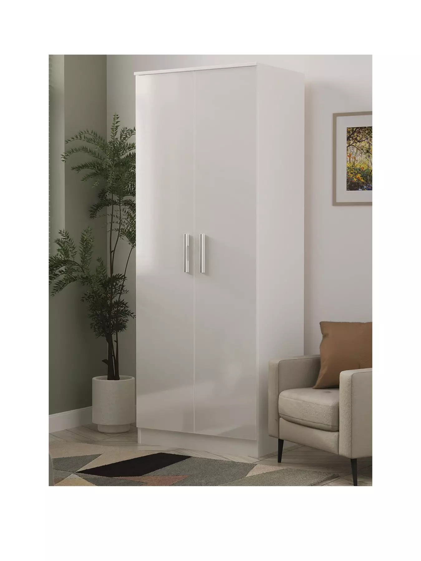 The doors are complemented by sleek metal handles, and when you open them up you'll discover a linen-look lining, hanging rail and shelf.