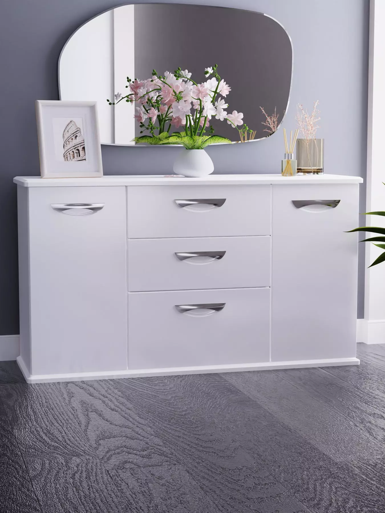 Soft close drawers and door hinges help prevent them from slamming shut, reducing noise and preventing damage to them over time. The sideboard is accented with contemporary butterfly handles, and a range of matching furniture is available separately. You can also get this sideboard in grey high gloss (see item number MQYUJ).