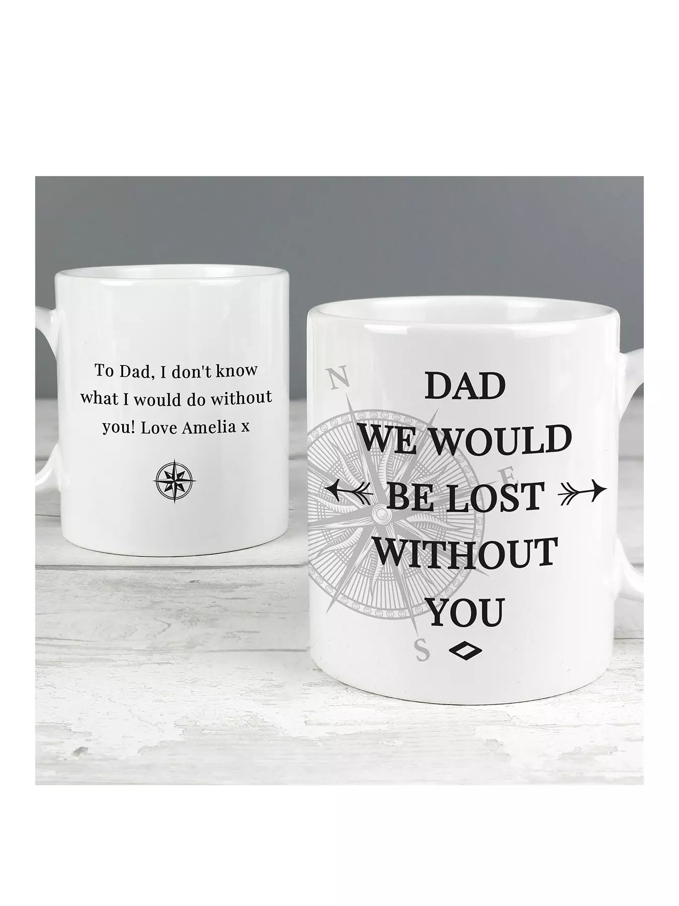 A wonderful gift for a very special dad, this personalised mug features the phrase "Dad we would be lost without you" styled with a compass design to the front and can be personalised with your own special message to the reverse.It is a truly unique and thoughtful gift that will melt the heart of even the toughest dad. It is also a practical gift that he can use every single day, while putting a smile on his face with each brew he pours.