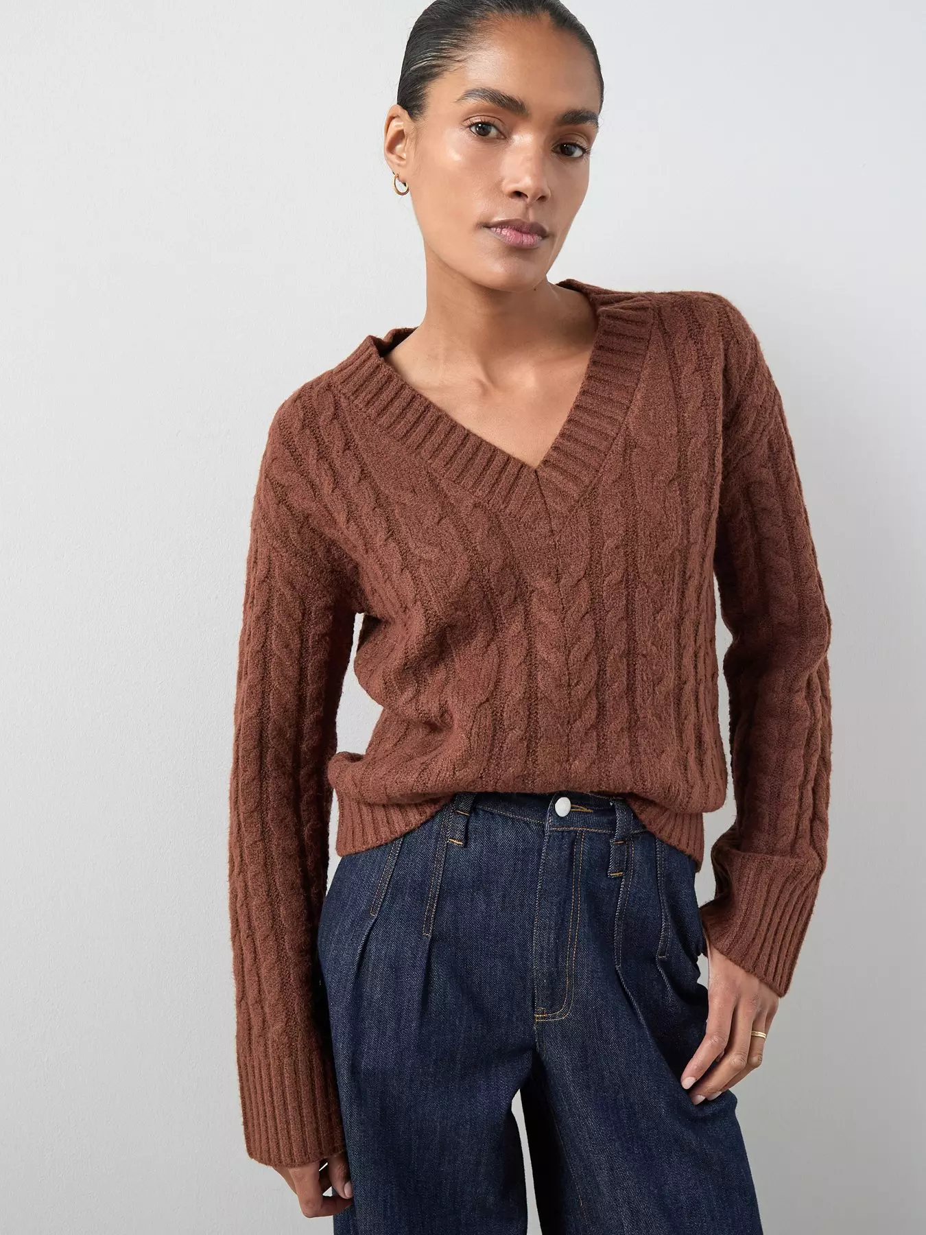 The Very Collection Cosy Yarn V Neck Cable Knit Jumper With Wool - Brown