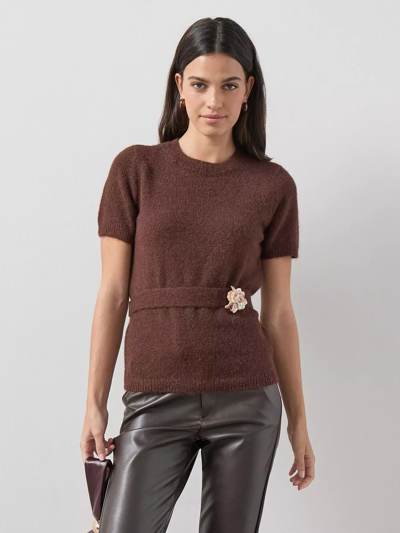 The Very CollectionCrew Neck Belted Jumper with Detachable Brooch - Chocolate