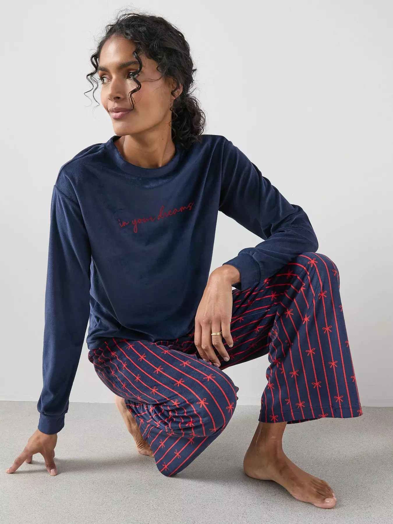 The Very CollectionFlock Placement Baby Fleece Top And Ribbon Print Wide Leg Pj Set - Navy