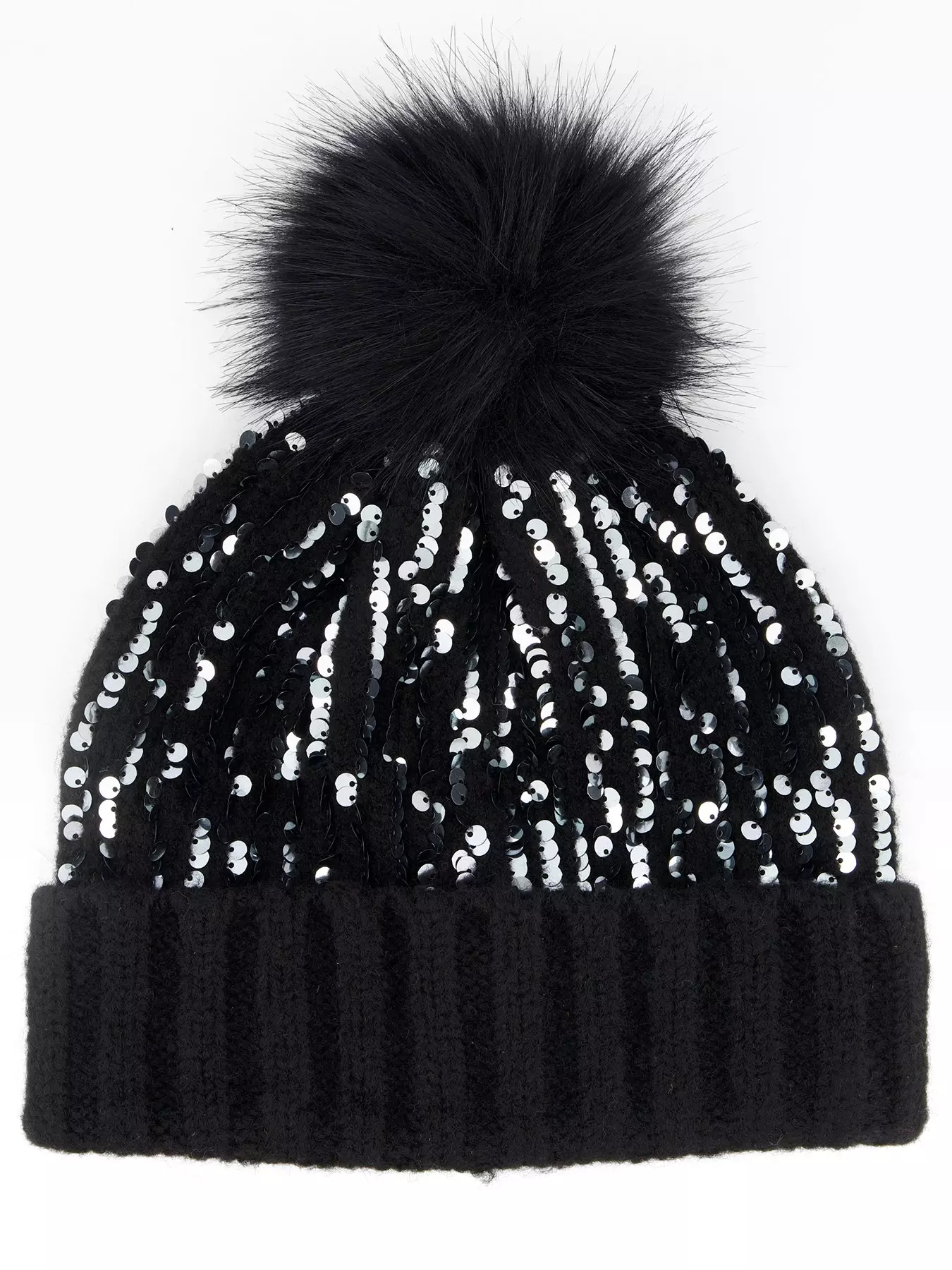 The Very Collection Knitted Sequin Beanie With Faux Fur Pom Pom - Black