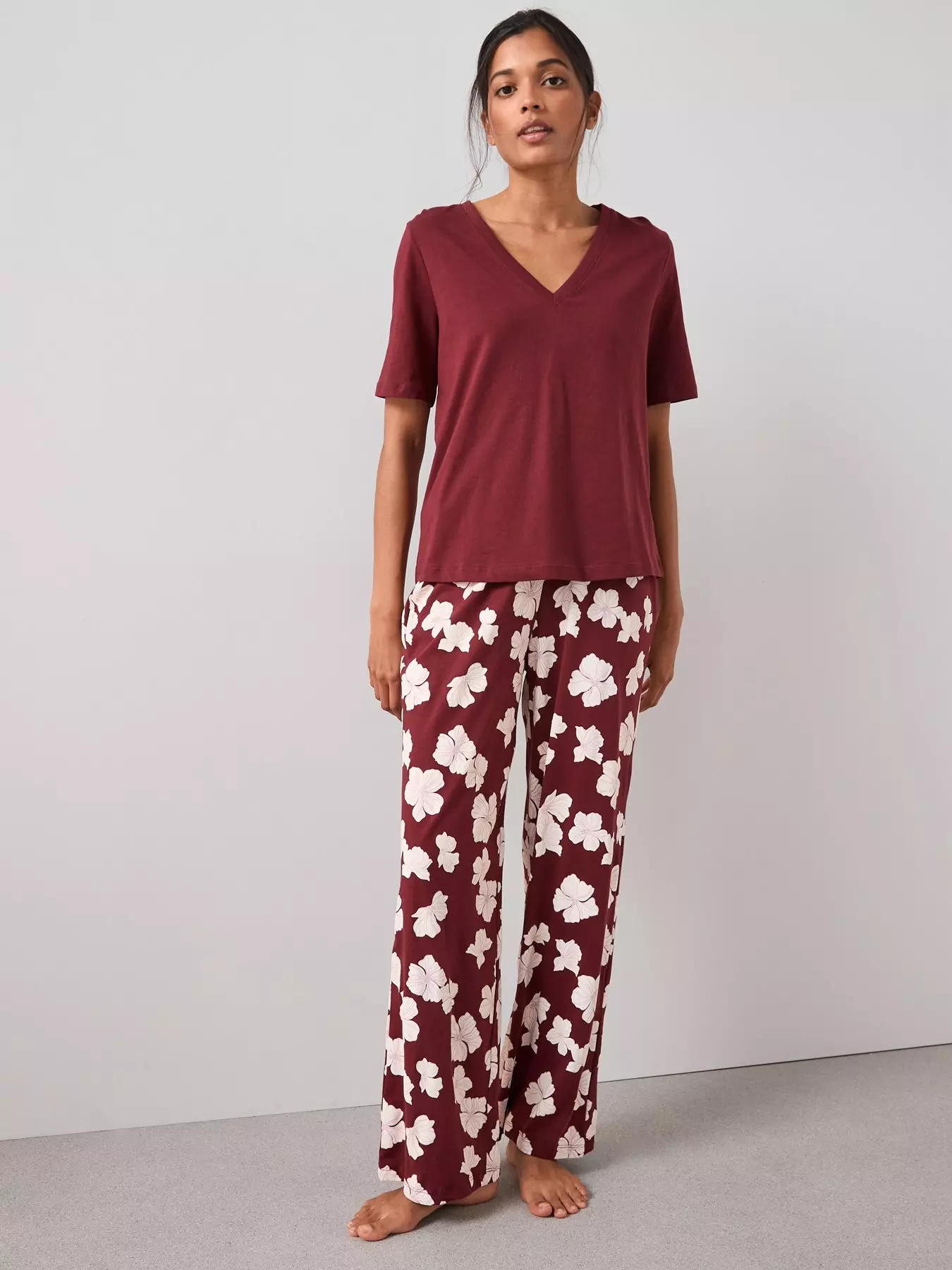 The Very CollectionV Neck Tshirt With Floral Aop Wide Leg Pj Set - Burgundy