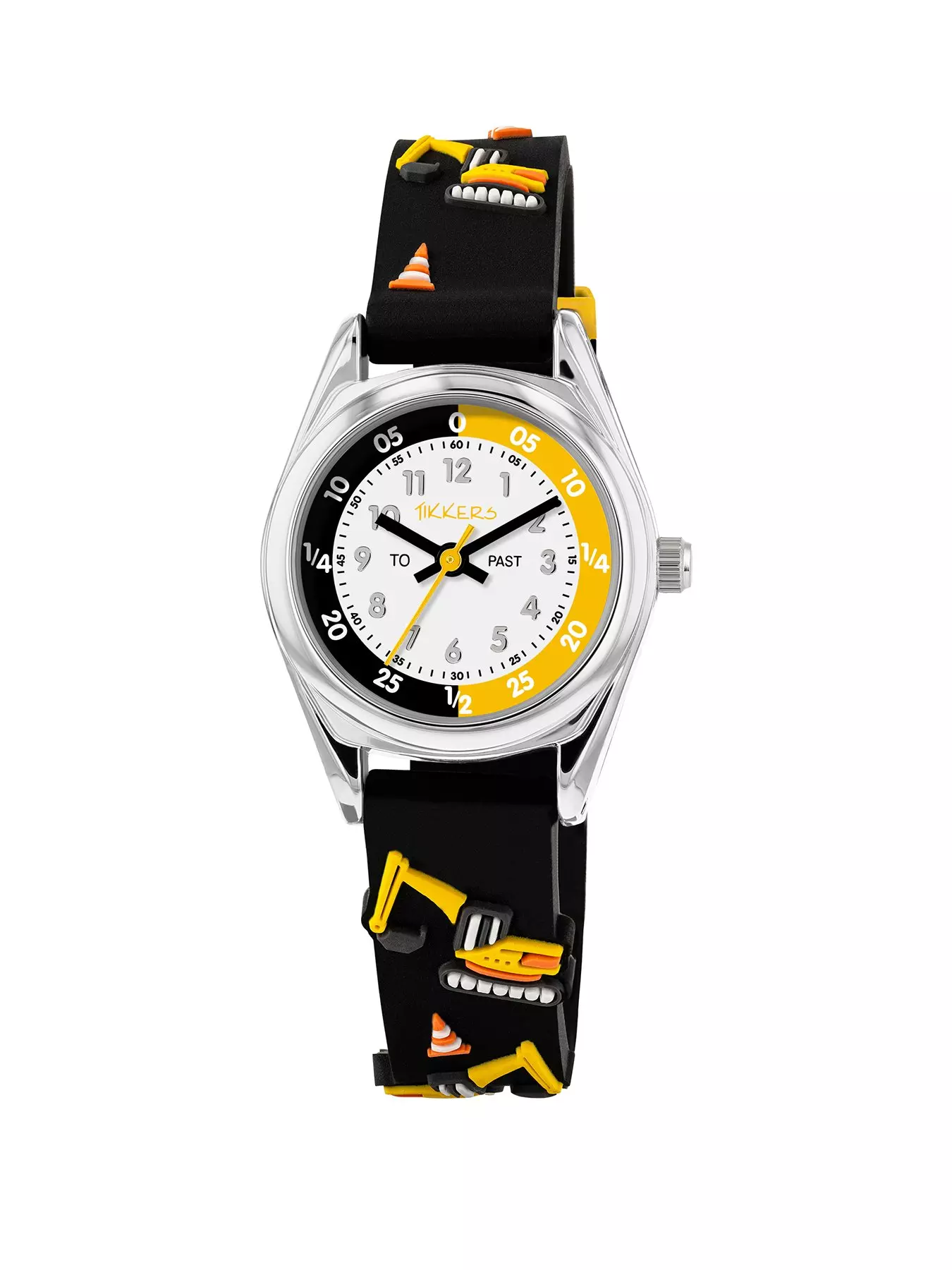 This awesome black silicone strap watch features bold orange 3D diggers, making every second feel like an adventure. The 25mm time-teacher dial is designed to help kids learn to tell the time with ease and confidence. The soft, flexible strap is not only comfy but also adjustable, perfect for growing wrists. Tough and cool, this watch is the ideal companion for young builders who want to master time with style! All Tikkers watches have a one year guarantee.- 24Hr Display: Y