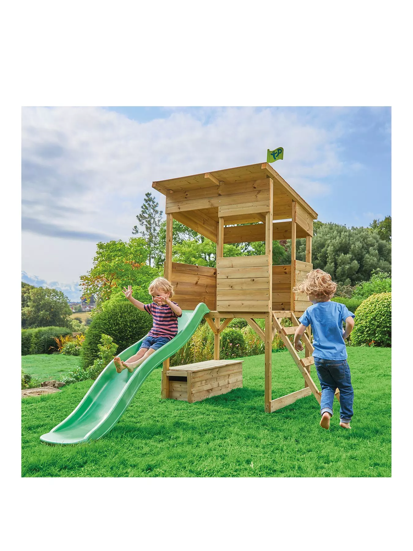 With an open-panel design that lets kids see the world around them, the upper lookout deck can be accessed via a ladder to one side, while the wavy slide offers a quick way back down. A large surface area in this upper area provides plenty of space for play, and the roof helps to keep the sun out of their eyes. This playhouse also has a toybox in the base that makes it easy to keep your garden clear and tidy.Made from European wood, the predrilled pieces are easy to assemble, so children will be enjoying lots of exciting new adventures before they know it.