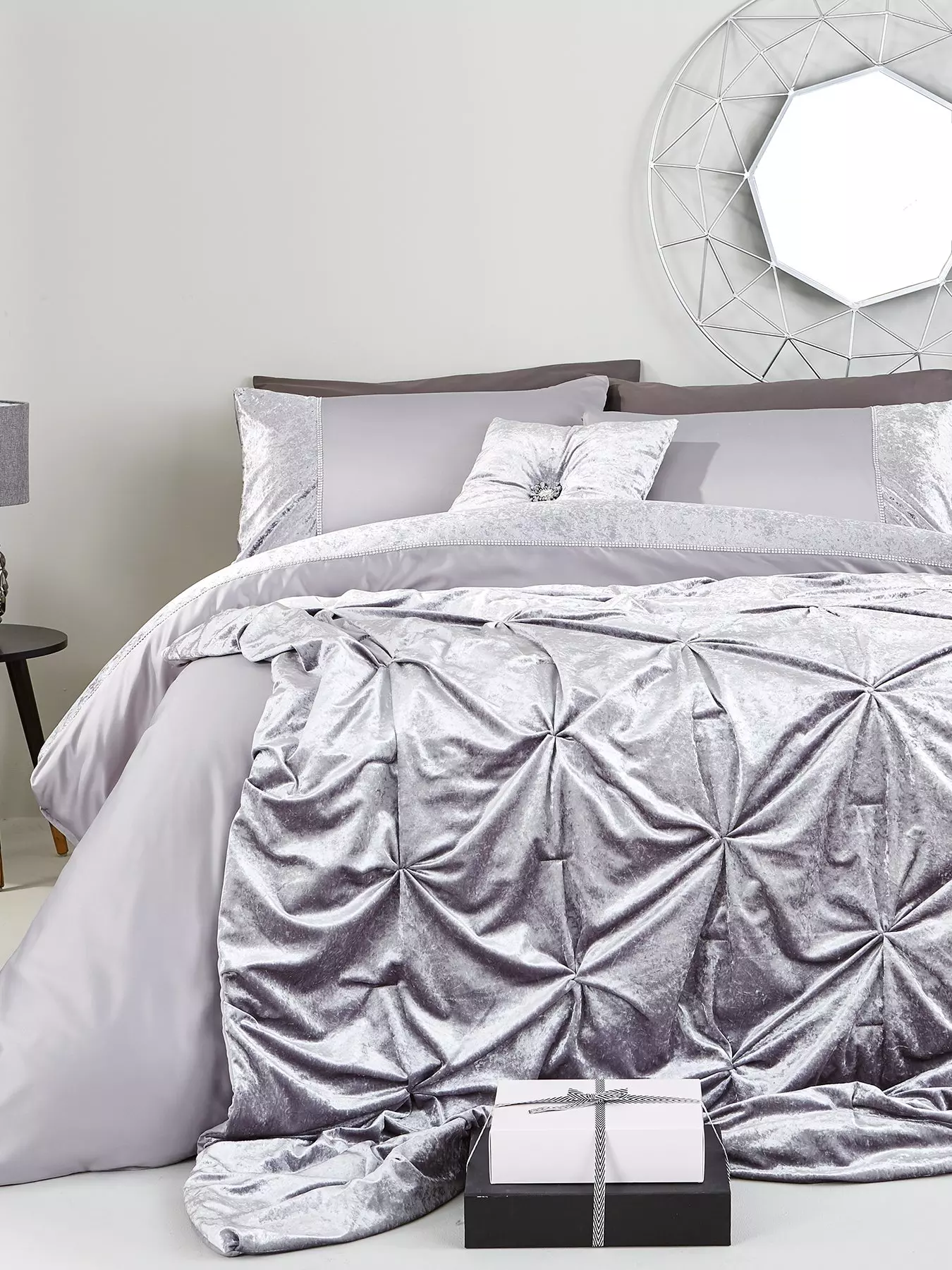 A stunning complement to the matching duvet cover set, available separately (see item number KXCGC), this gorgeous bedspread throw is perfect for letting you luxuriate in silky smooth style.In silver, it flaunts a crushed velvet design, with evenly spaced pintucks giving it a charming finish.